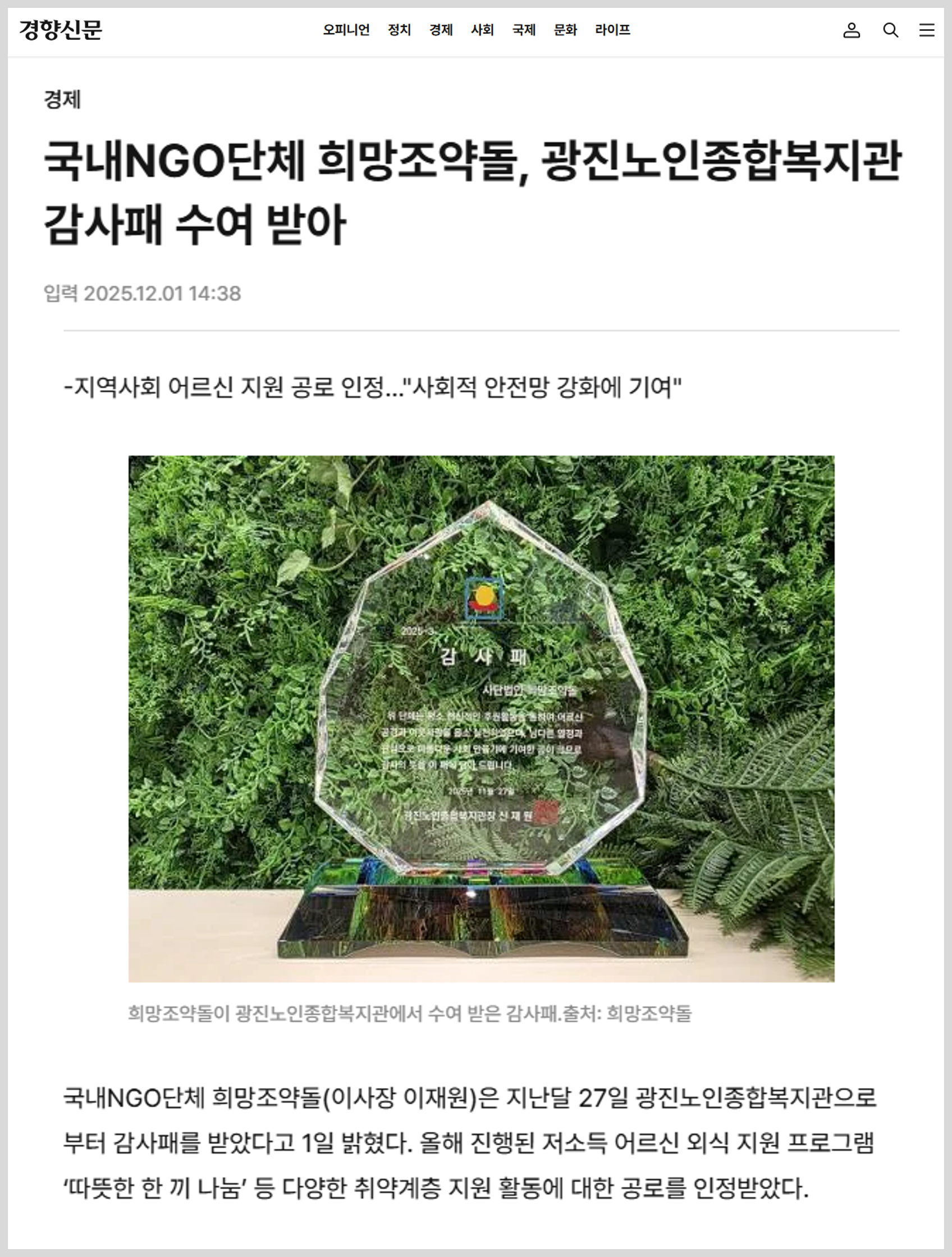 국내NGO단체 희망조약돌(이사장 이재원)은 지난달 27일 광진노인종합복지관으로부터 감사패를 받았다고 1일 밝혔다. 올해 진행된 저소득 어르신 외식 지원 프로그램 ‘따뜻한 한 끼 나눔’ 등 다양한 취약계층 지원 활동에 대한 공로를 인정받았다. 희망조약돌은 광진노인종합복지관과 함께 경제적·신체적 사유로 외식이 어려운 어르신들을 위해 따뜻한 한 끼 나눔 프로그램을 2022년 1월부터 정기적으로 운영해오고 있다. 지난 추석에는 취약계층 어르신을 대상으로 한 명절행사 사랑나누기 한마당을 개최해 명절을 홀로 보내는 어르신들에게 따뜻한 나눔을 전하기도 했다.