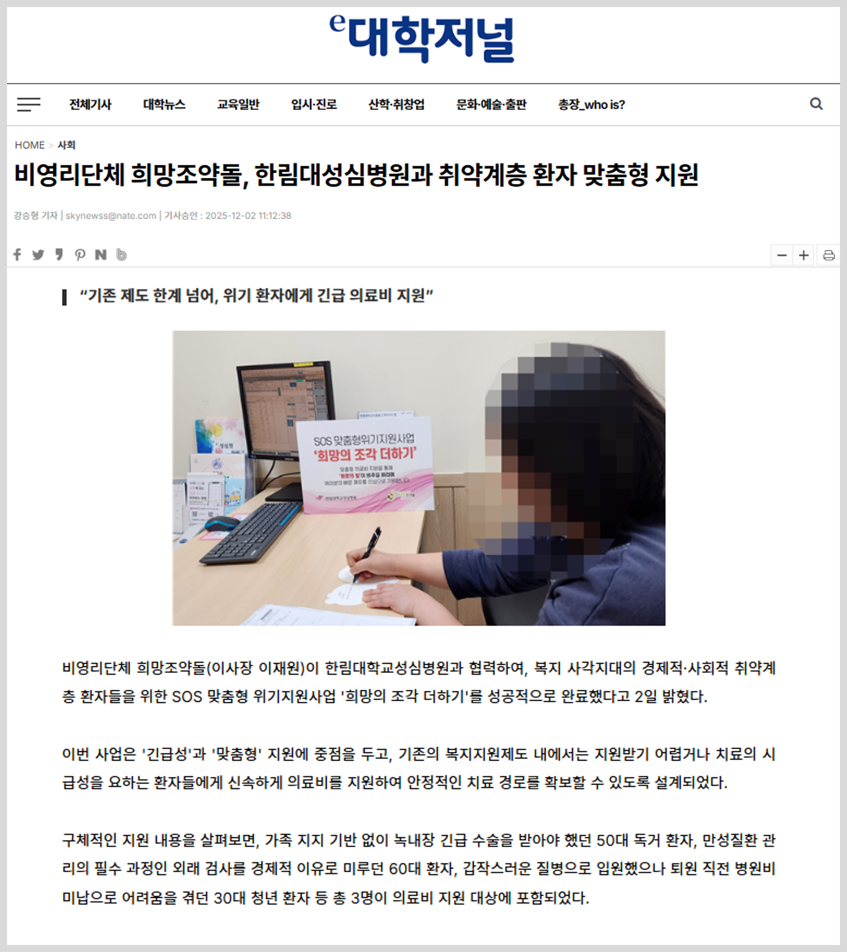 비영리단체 희망조약돌(이사장 이재원)이 한림대학교성심병원과 협력하여, 복지 사각지대의 경제적·사회적 취약계층 환자들을 위한 SOS 맞춤형 위기지원사업 '희망의 조각 더하기'를 성공적으로 완료했다고 2일 밝혔다. 이번 사업은 '긴급성'과 '맞춤형' 지원에 중점을 두고, 기존의 복지지원제도 내에서는 지원받기 어렵거나 치료의 시급성을 요하는 환자들에게 신속하게 의료비를 지원하여 안정적인 치료 경로를 확보할 수 있도록 설계되었다.