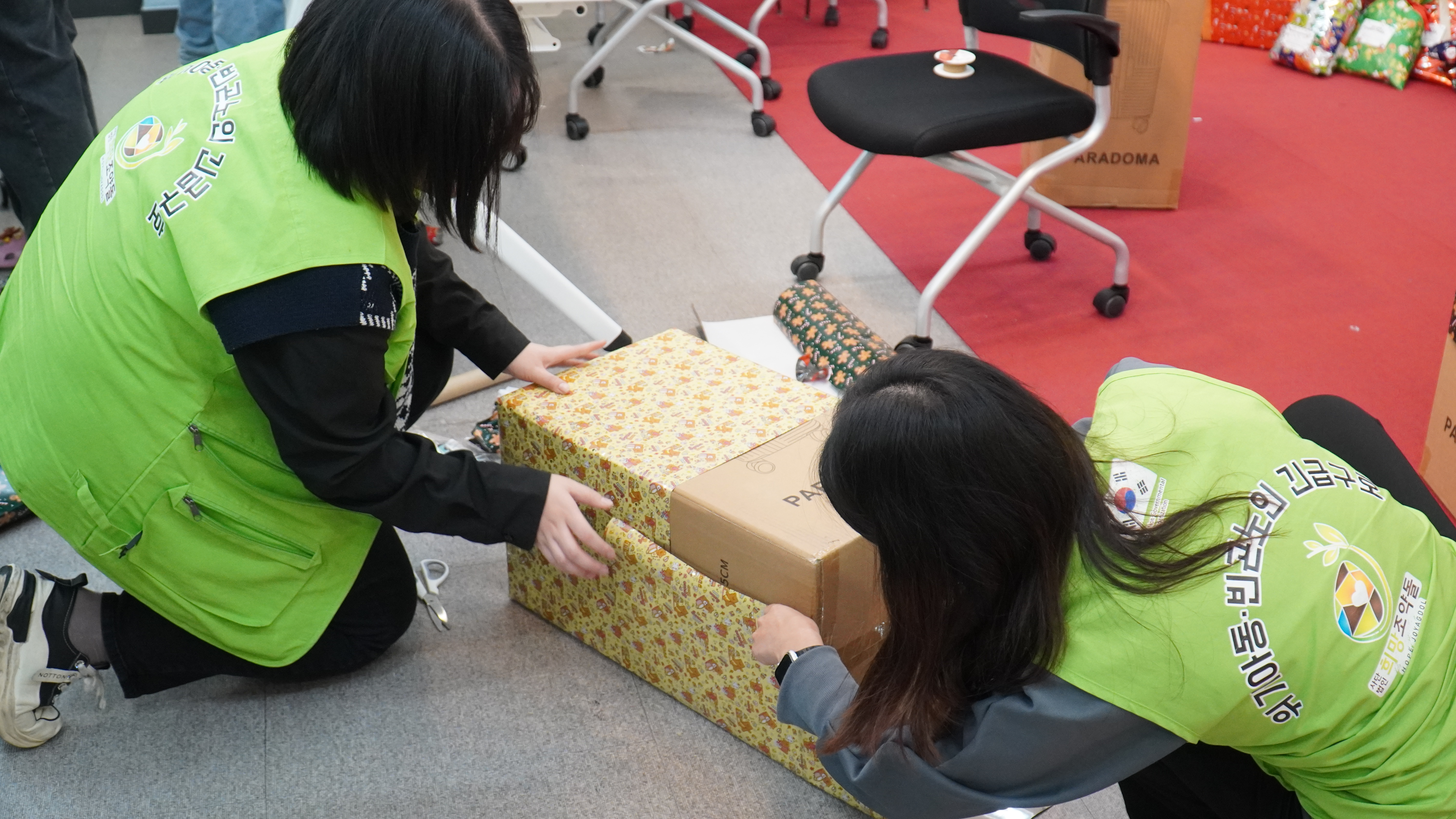 마지막으로 희망조약돌 홍보대사 분들과 함께 예쁘게 포장한 선물들을 들고 아이들에게 전달했습니다.