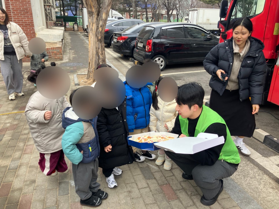 아동들에게 피자 나눔 행사를 하며