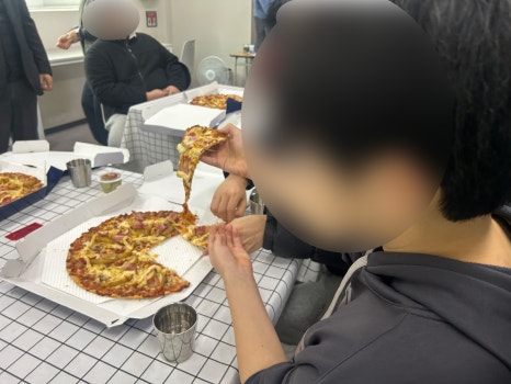 다들 가져온 피자를 맛있게 먹기 시작했습니다.