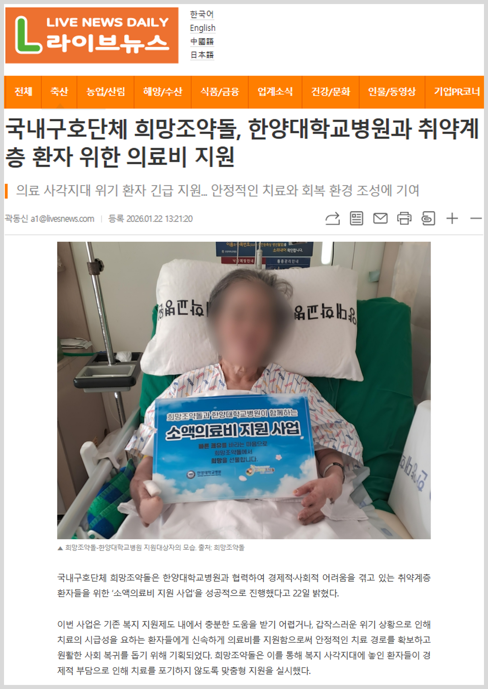 국내구호단체 희망조약돌은 한양대학교병원과 협력하여 경제적·사회적 어려움을 겪고 있는 취약계층 환자들을 위한 ‘소액의료비 지원 사업’을 성공적으로 진행했다고 22일 밝혔다. 이번 사업은 기존 복지 지원제도 내에서 충분한 도움을 받기 어렵거나, 갑작스러운 위기 상황으로 인해 치료의 시급성을 요하는 환자들에게 신속하게 의료비를 지원함으로써 안정적인 치료 경로를 확보하고 원활한 사회 복귀를 돕기 위해 기획되었다.