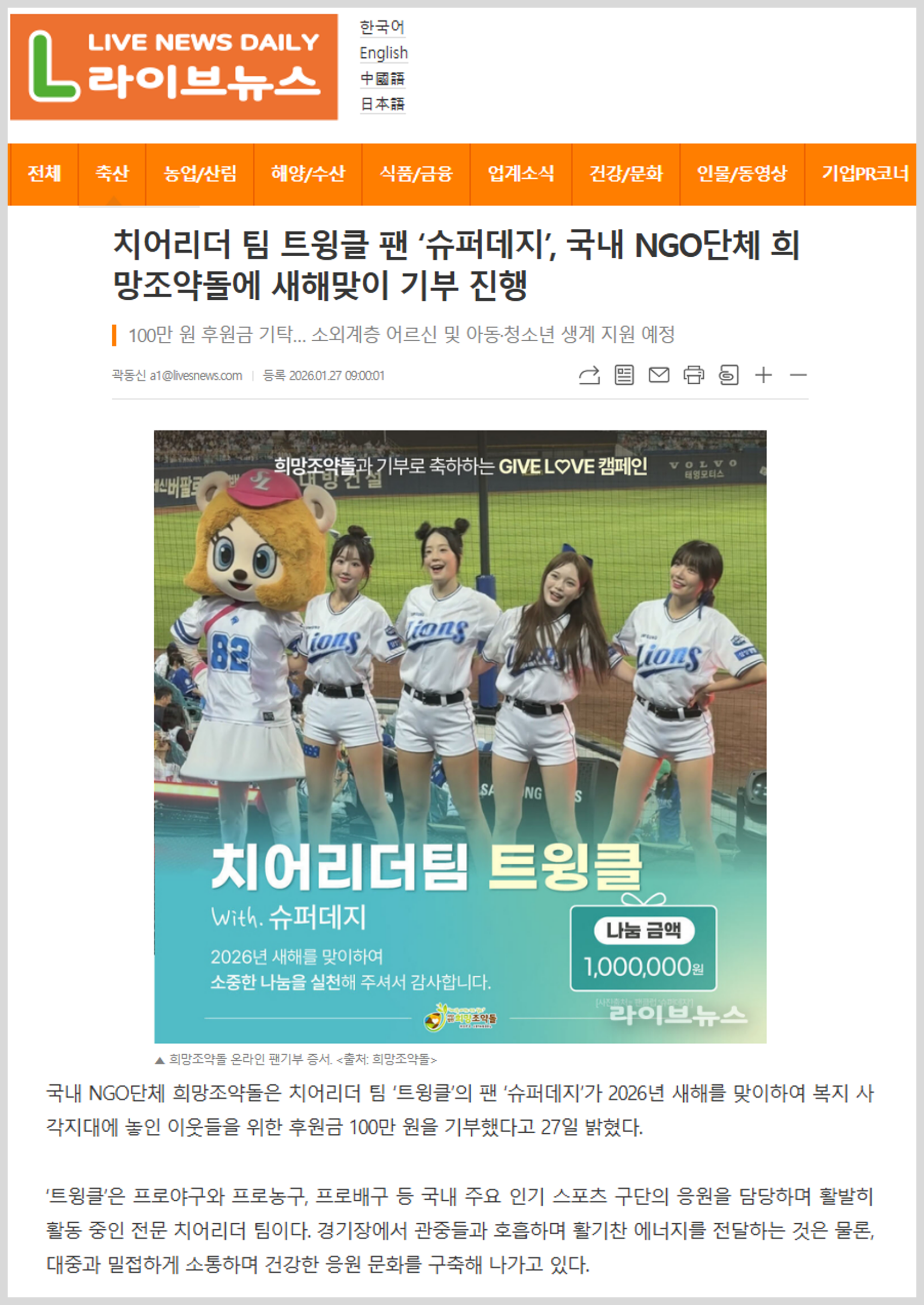 국내 NGO단체 희망조약돌은 치어리더 팀 ‘트윙클’의 팬 ‘슈퍼데지’가 2026년 새해를 맞이하여 복지 사각지대에 놓인 이웃들을 위한 후원금 100만 원을 기부했다고 27일 밝혔다. ‘트윙클’은 프로야구와 프로농구, 프로배구 등 국내 주요 인기 스포츠 구단의 응원을 담당하며 활발히 활동 중인 전문 치어리더 팀이다. 경기장에서 관중들과 호흡하며 활기찬 에너지를 전달하는 것은 물론, 대중과 밀접하게 소통하며 건강한 응원 문화를 구축해 나가고 있다.
