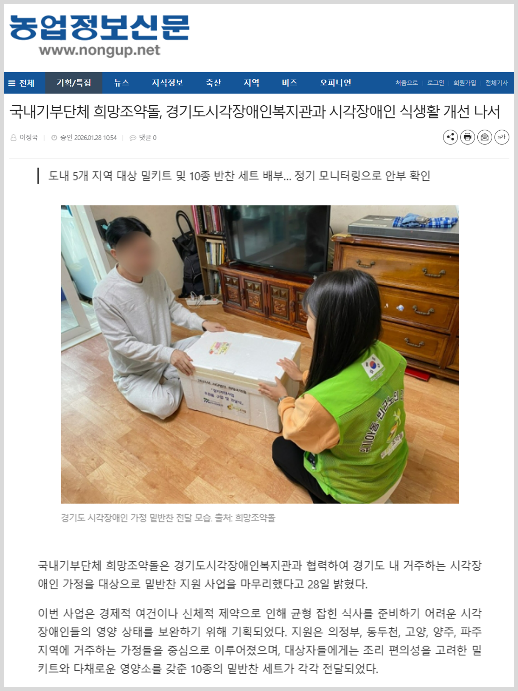 국내기부단체 희망조약돌은 경기도시각장애인복지관과 협력하여 경기도 내 거주하는 시각장애인 가정을 대상으로 밑반찬 지원 사업을 마무리했다고 28일 밝혔다. 이번 사업은 경제적 여건이나 신체적 제약으로 인해 균형 잡힌 식사를 준비하기 어려운 시각장애인들의 영양 상태를 보완하기 위해 기획되었다. 지원은 의정부, 동두천, 고양, 양주, 파주 지역에 거주하는 가정들을 중심으로 이루어졌으며, 대상자들에게는 조리 편의성을 고려한 밀키트와 다채로운 영양소를 갖춘 10종의 밑반찬 세트가 각각 전달되었다.