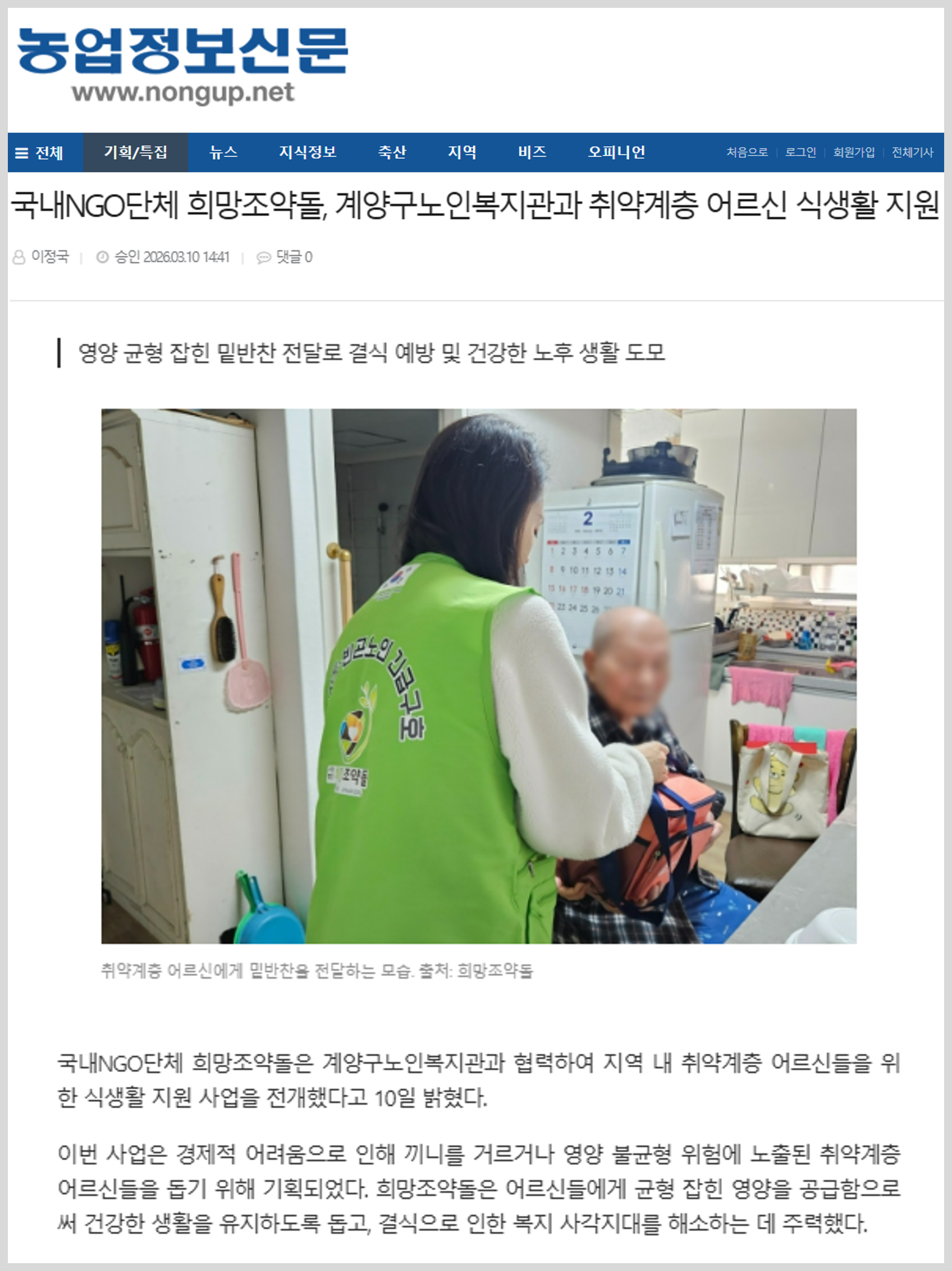 국내NGO단체 희망조약돌, 계양구노인복지관과 취약계층 어르신 식생활 지원