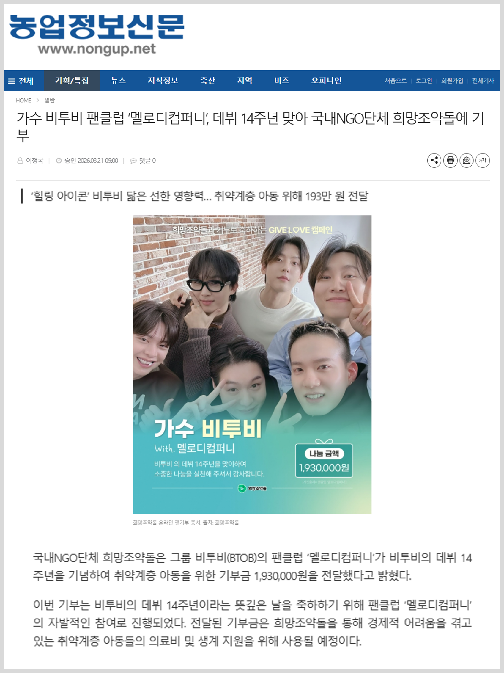 국내NGO단체 희망조약돌은 그룹 비투비(BTOB)의 팬클럽 ‘멜로디컴퍼니’가 비투비의 데뷔 14주년을 기념하여 취약계층 아동을 위한 기부금 1,930,000원을 전달했다고 밝혔다. 이번 기부는 비투비의 데뷔 14주년이라는 뜻깊은 날을 축하하기 위해 팬클럽 ‘멜로디컴퍼니’의 자발적인 참여로 진행되었다. 전달된 기부금은 희망조약돌을 통해 경제적 어려움을 겪고 있는 취약계층 아동들의 의료비 및 생계 지원을 위해 사용될 예정이다.