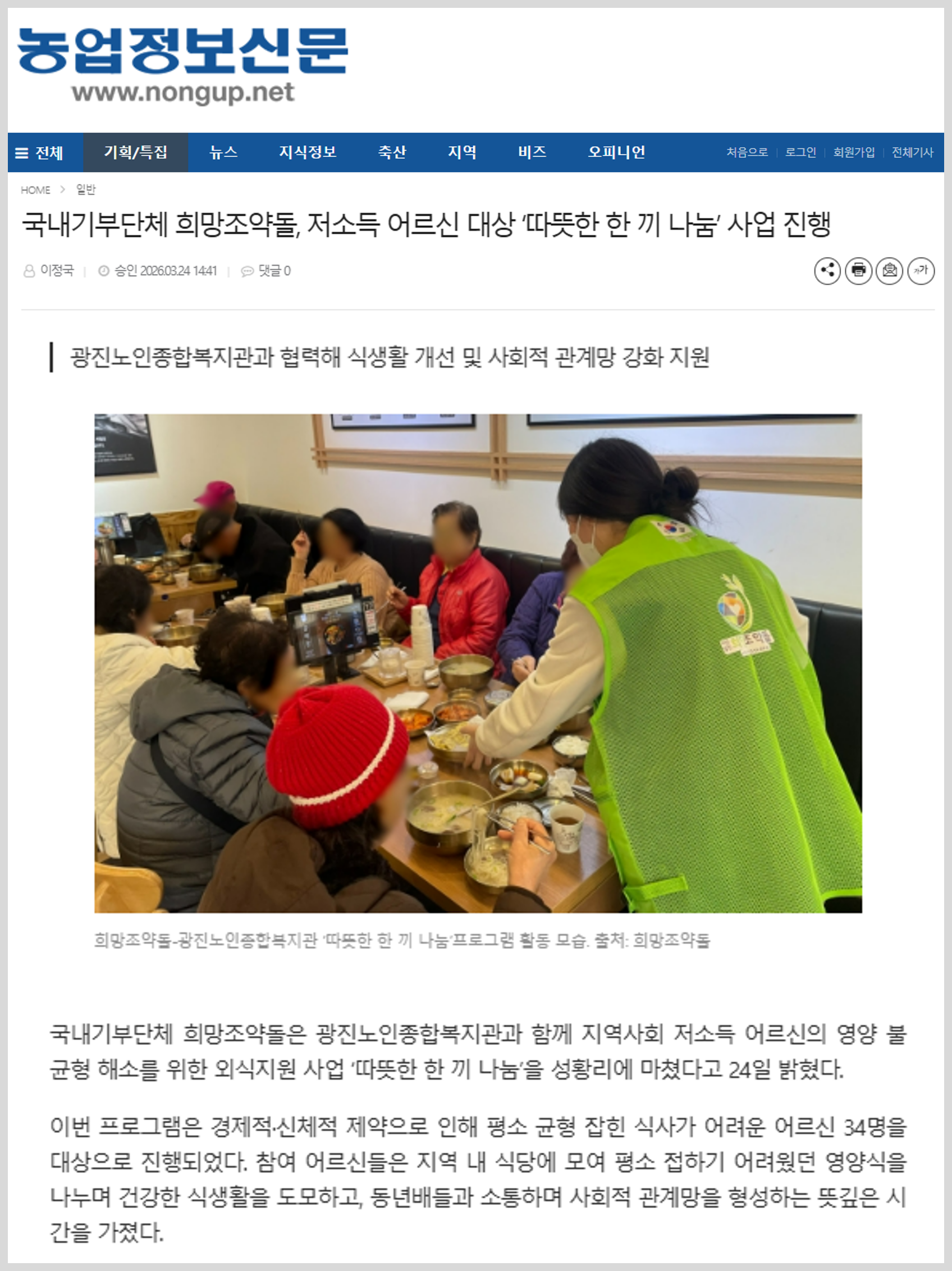 국내기부단체 희망조약돌은 광진노인종합복지관과 함께 지역사회 저소득 어르신의 영양 불균형 해소를 위한 외식지원 사업 ‘따뜻한 한 끼 나눔’을 성황리에 마쳤다고 24일 밝혔다. 이번 프로그램은 경제적·신체적 제약으로 인해 평소 균형 잡힌 식사가 어려운 어르신 34명을 대상으로 진행되었다. 참여 어르신들은 지역 내 식당에 모여 평소 접하기 어려웠던 영양식을 나누며 건강한 식생활을 도모하고, 동년배들과 소통하며 사회적 관계망을 형성하는 뜻깊은 시간을 가졌다.