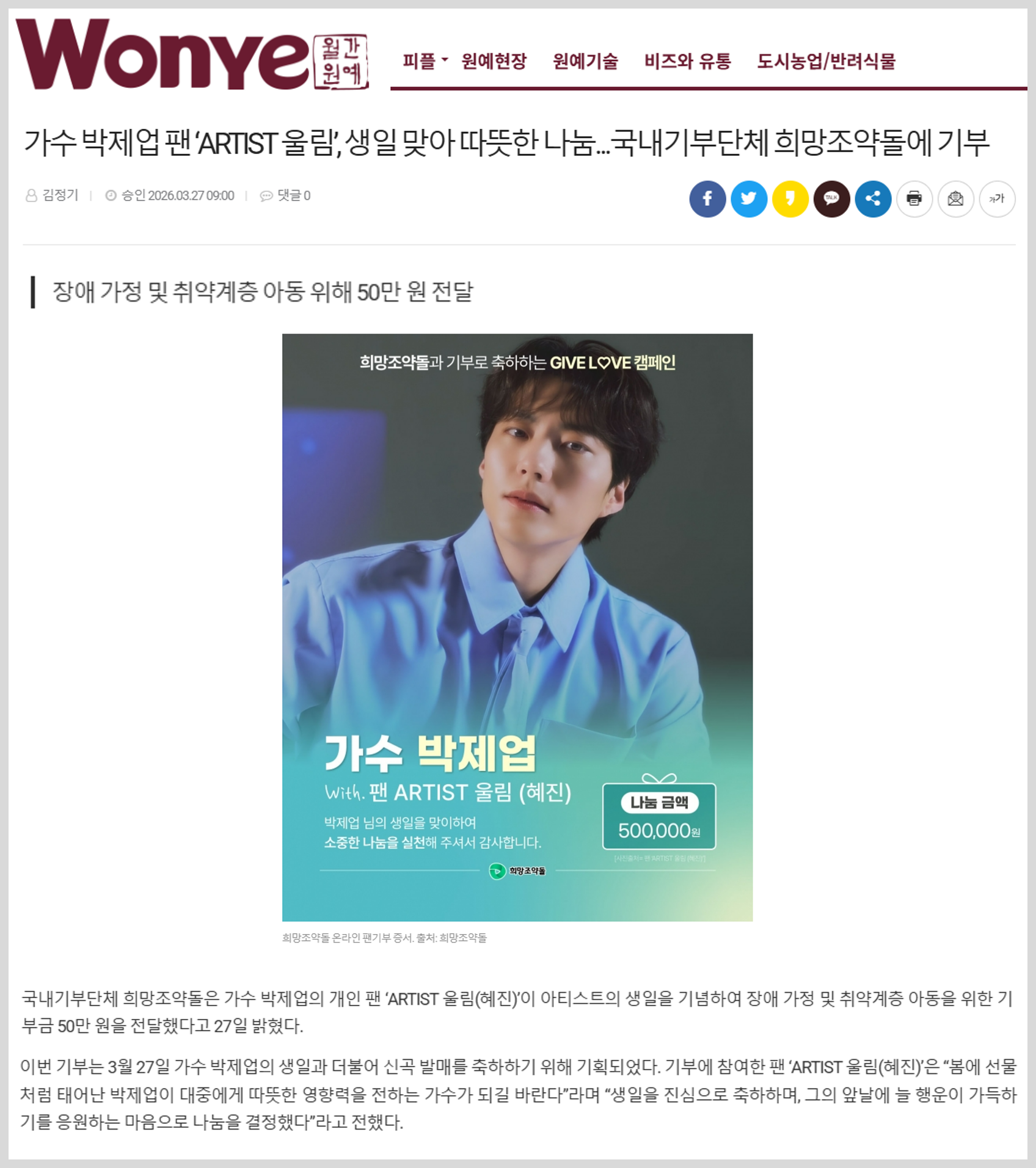 국내기부단체 희망조약돌은 가수 박제업의 개인 팬 ‘ARTIST 울림(혜진)’이 아티스트의 생일을 기념하여 장애 가정 및 취약계층 아동을 위한 기부금 50만 원을 전달했다고 27일 밝혔다. 이번 기부는 3월 27일 가수 박제업의 생일과 더불어 신곡 발매를 축하하기 위해 기획되었다. 기부에 참여한 팬 ‘ARTIST 울림(혜진)’은 “봄에 선물처럼 태어난 박제업이 대중에게 따뜻한 영향력을 전하는 가수가 되길 바란다”라며 “생일을 진심으로 축하하며, 그의 앞날에 늘 행운이 가득하기를 응원하는 마음으로 나눔을 결정했다”라고 전했다.