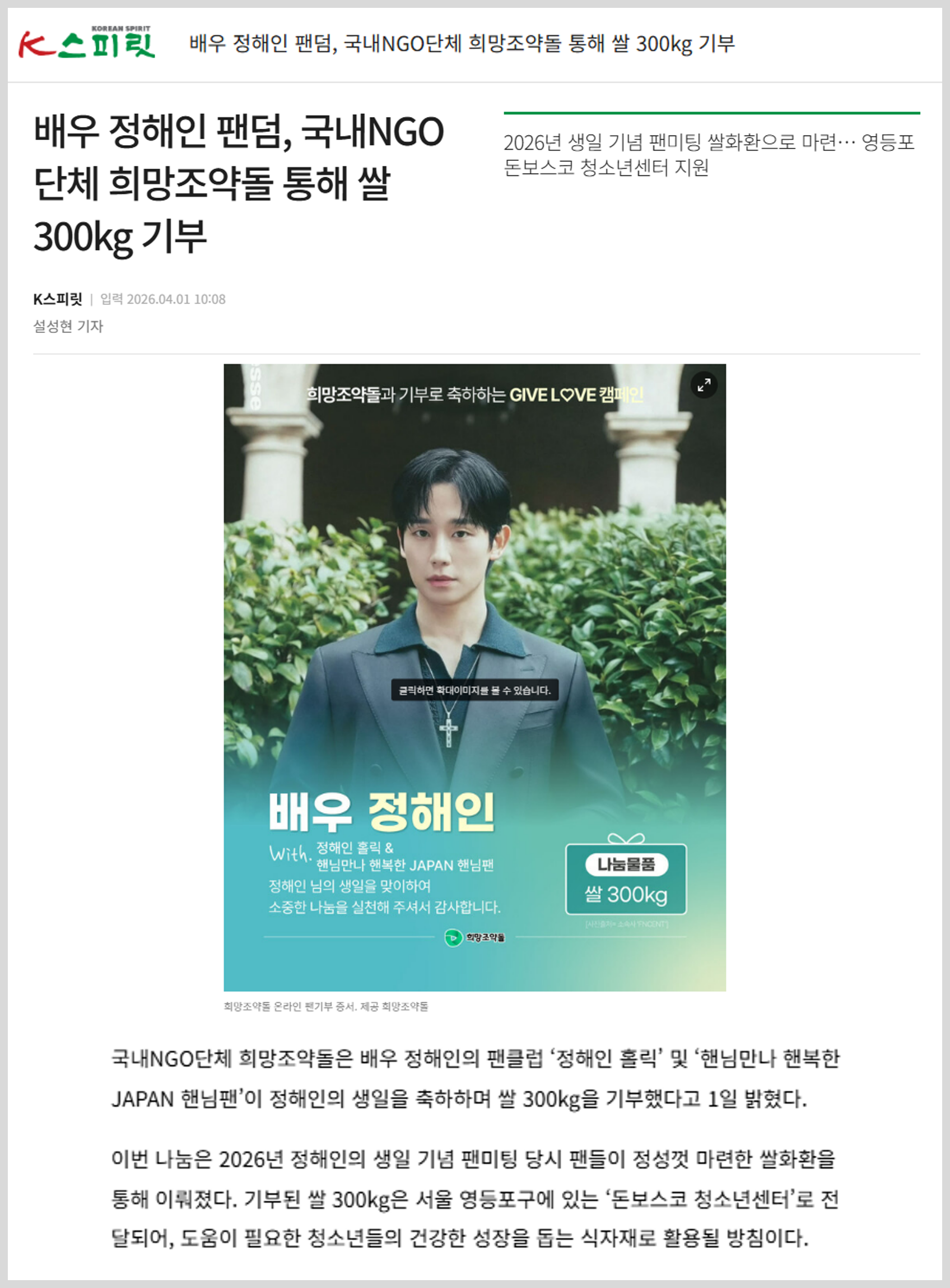 국내NGO단체 희망조약돌은 배우 정해인의 팬클럽 ‘정해인 홀릭’ 및 ‘핸님만나 핸복한 JAPAN 핸님팬’이 정해인의 생일을 축하하며 쌀 300kg을 기부했다고 1일 밝혔다. 이번 나눔은 2026년 정해인의 생일 기념 팬미팅 당시 팬들이 정성껏 마련한 쌀화환을 통해 이뤄졌다. 기부된 쌀 300kg은 서울 영등포구에 있는 ‘돈보스코 청소년센터’로 전달되어, 도움이 필요한 청소년들의 건강한 성장을 돕는 식자재로 활용될 방침이다.