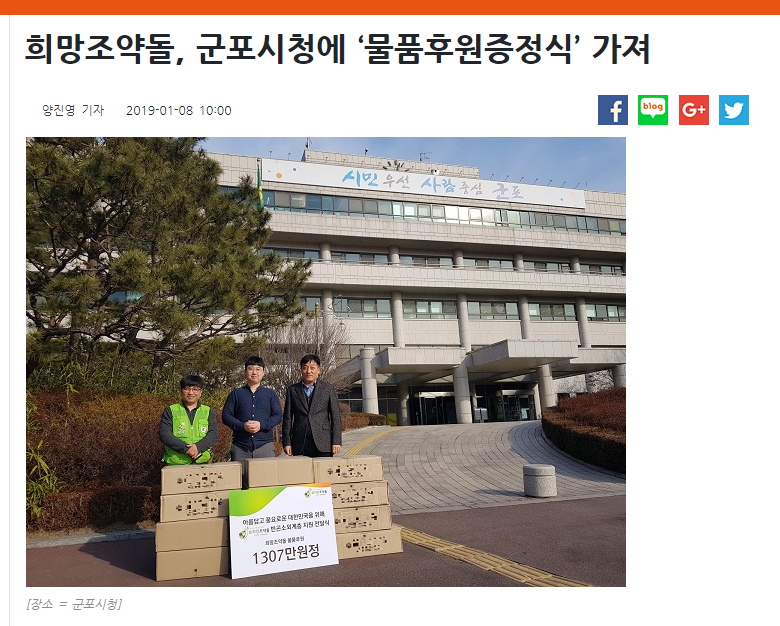 사단법인 희망조약돌이 지난 31일, 군포시청 앞에서 '물품후원증정식'을 가졌다.