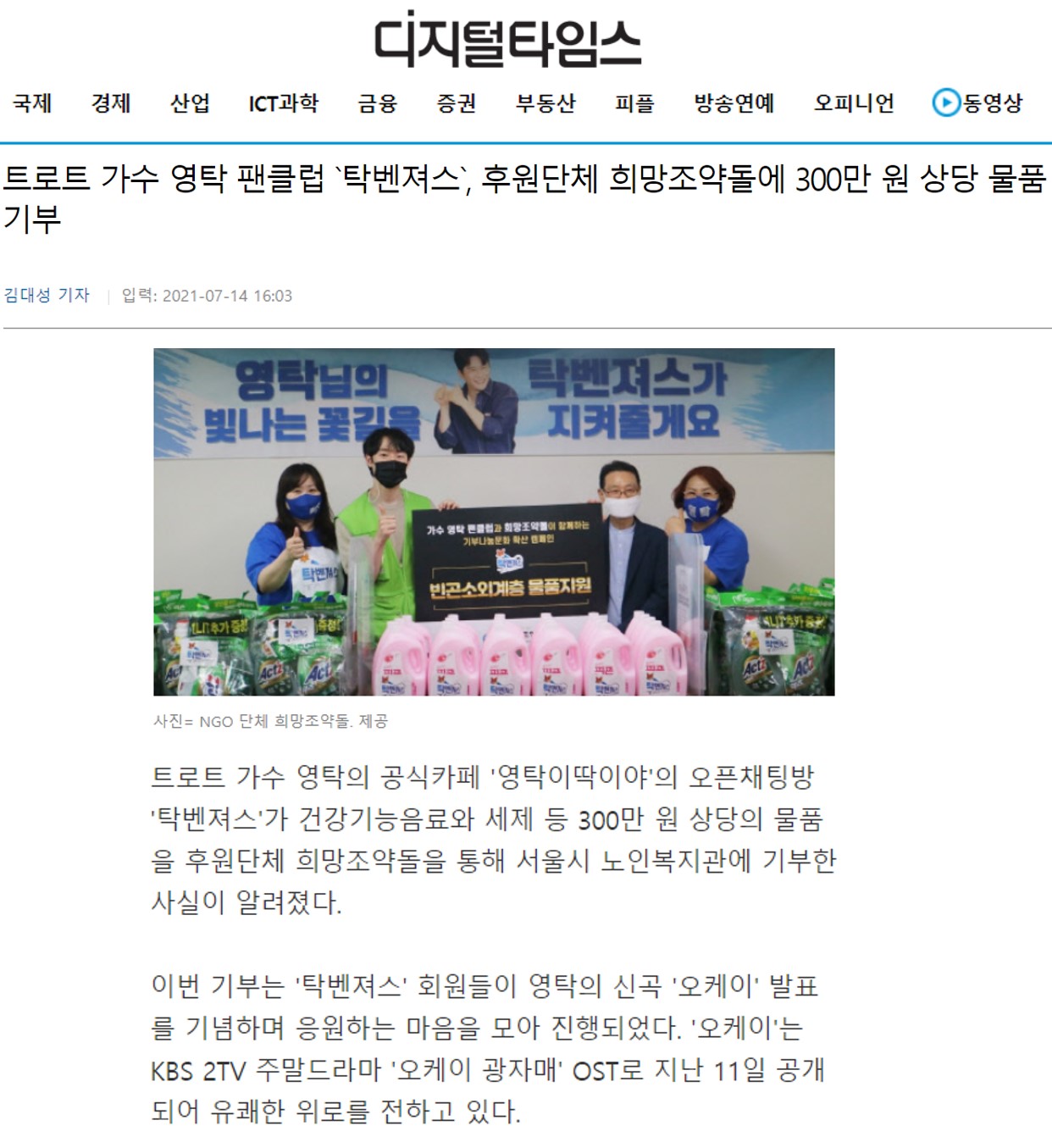 사랑을 영탁을 대신해 전달하겠다"라고 기부의 뜻을 밝혔다.