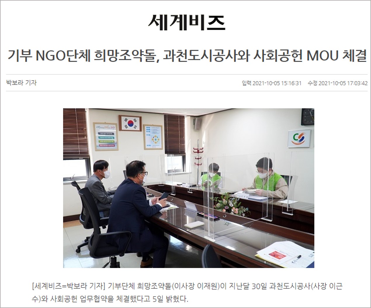기부단체 희망조약돌(이사장 이재원)이 지난달 30일 과천도시공사(사장 이근수)와