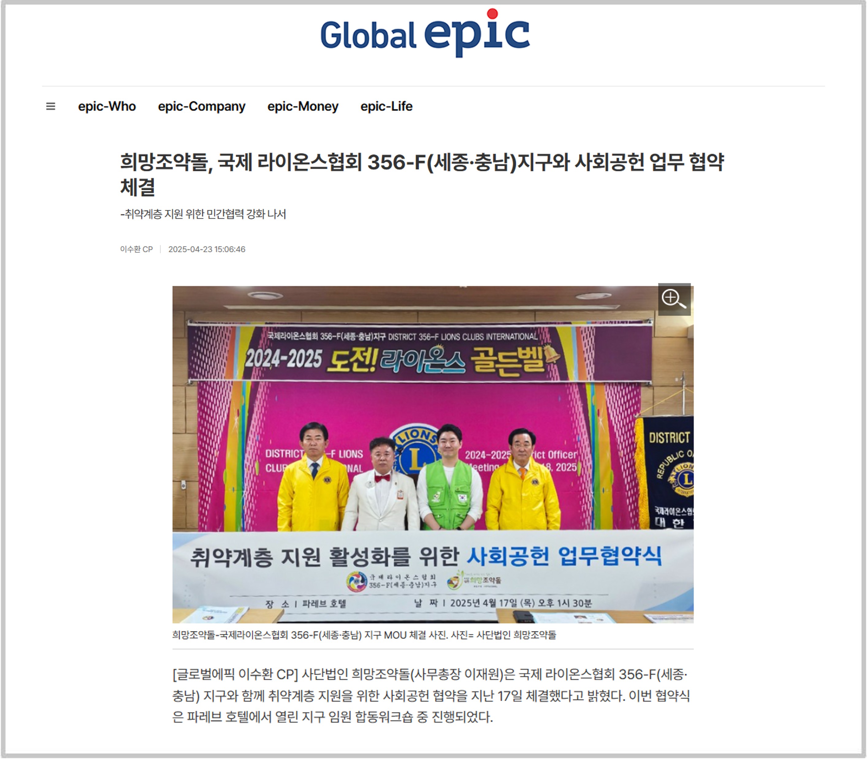 사단법인 희망조약돌(사무총장 이재원)은 국제 라이온스협회 356-F(세종·충남) 지구와 함께 취약계층 지원을 위한 사회공헌 협약을 지난 17일 체결했다고 밝혔다. 이번 협약식은 파레브 호텔에서 열린 지구 임원 합동워크숍 중 진행되었다.