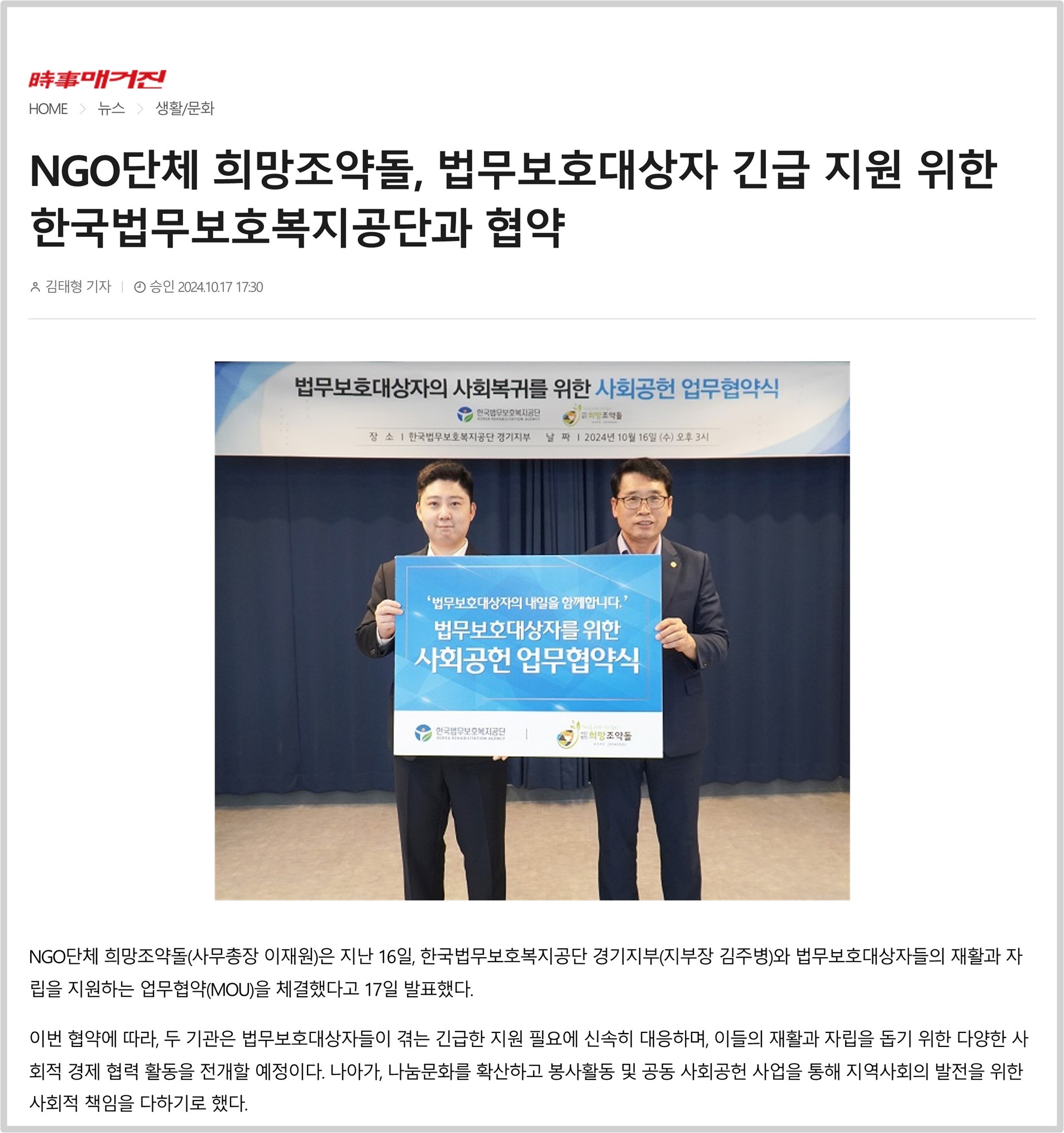 NGO단체 희망조약돌(사무총장 이재원)은 지난 16일, 한국법무보호복지공단 경기지부(지부장 김주병)와 법무보호대상자들의 재활과 자립을 지원하는 업무협약(MOU)을 체결했다고 17일 발표했다.