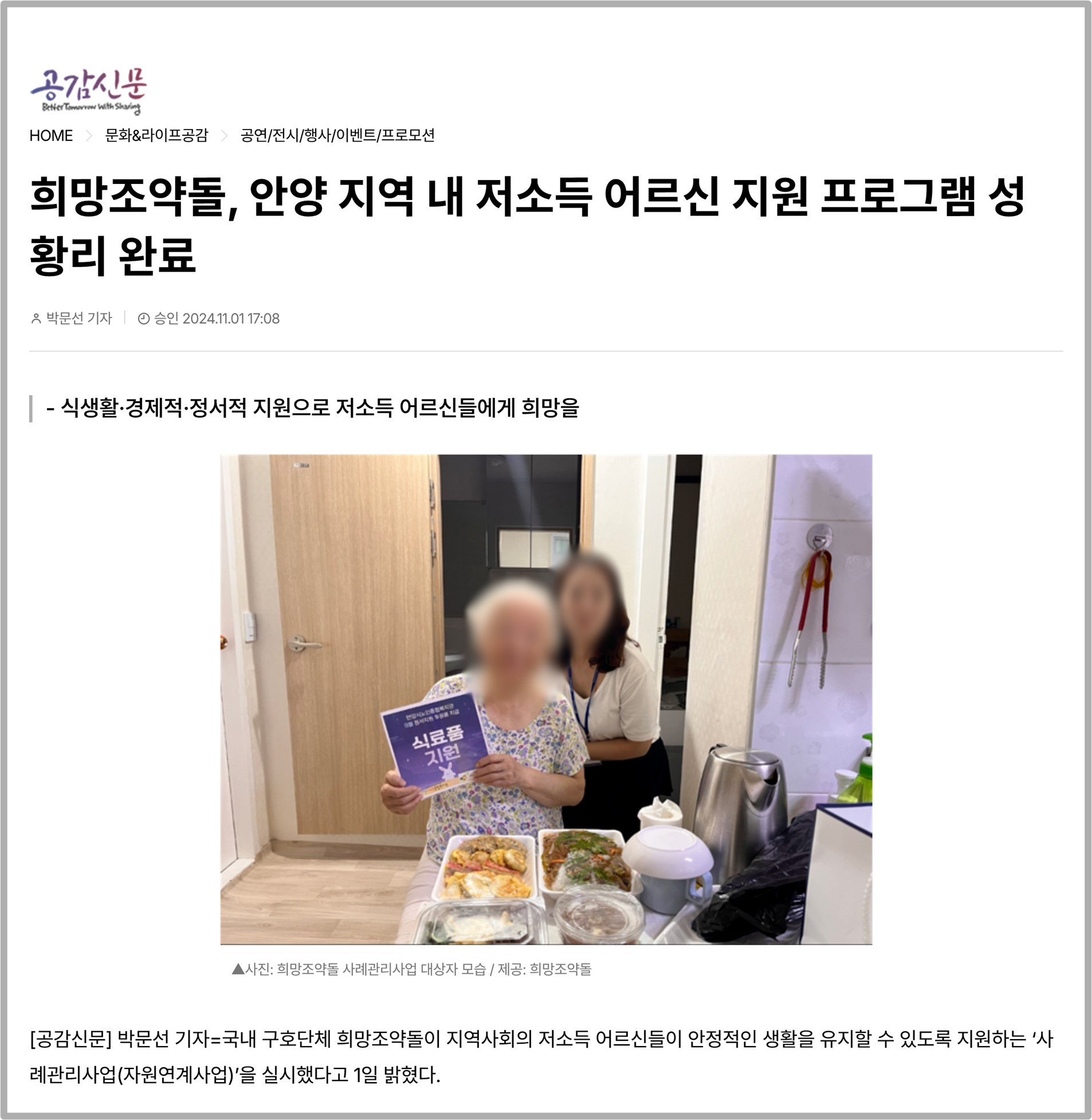 [공감신문] 박문선 기자=국내 구호단체 희망조약돌이 지역사회의 저소득 어르신들이 안정적인 생활을 유지할 수 있도록 지원하는 ‘사례관리사업(자원연계사업)’을 실시했다고 1일 밝혔다.