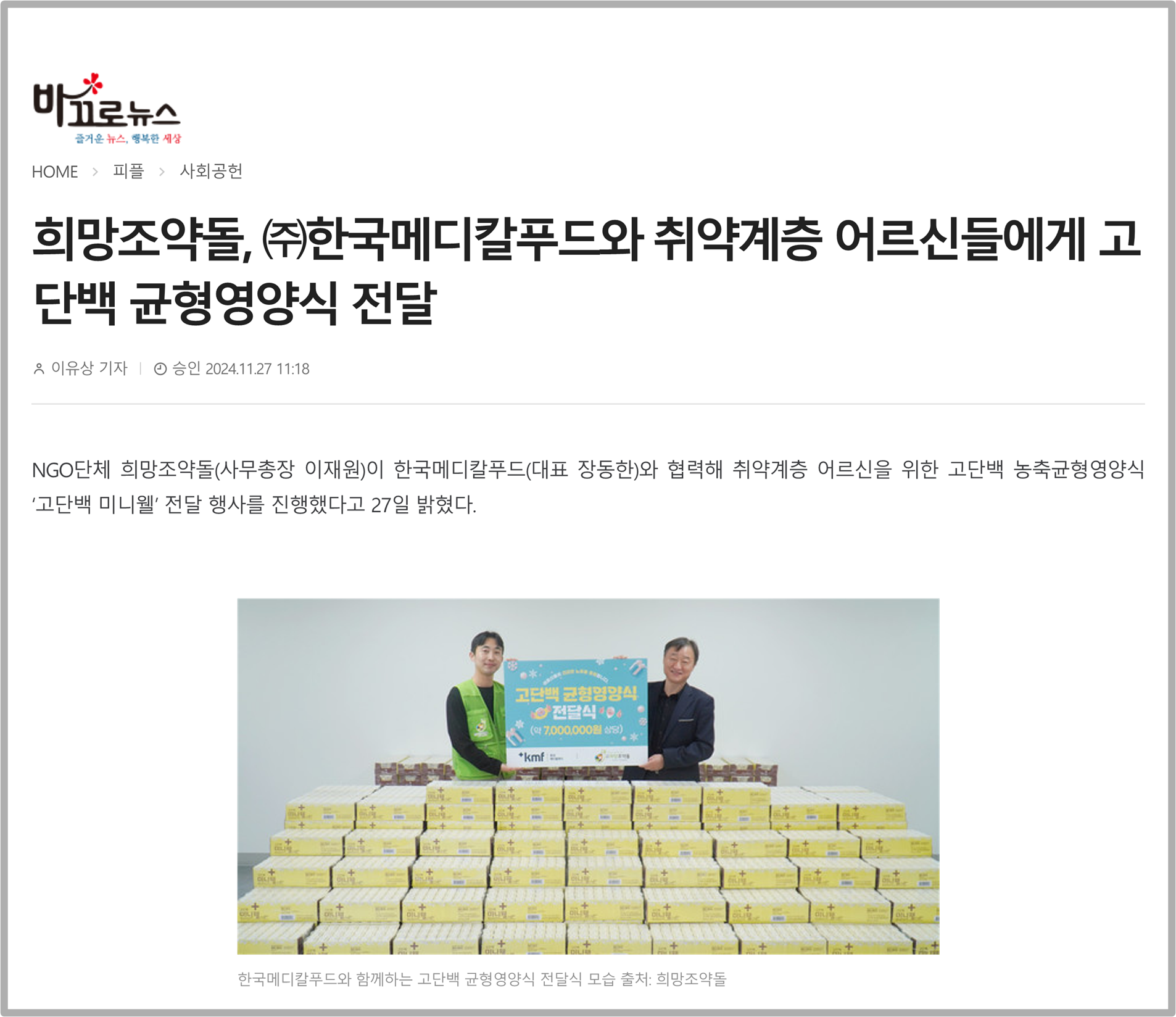 이번 행사는 군포시 송부종합사회복지관에서 열렸으며, 경제적 어려움으로 인해 영양 부족 상태에 놓인 취약계층 어르신들의 건강을 돕고 정서적 안정을 지원하고자 마련되었다. 희망조약돌과 한국메디칼푸드는 이번 지원을 통해 실질적인 도움을 제공하며 지역사회의 어르신들에게 건강과 희망을 전하고자 뜻을 모았다.