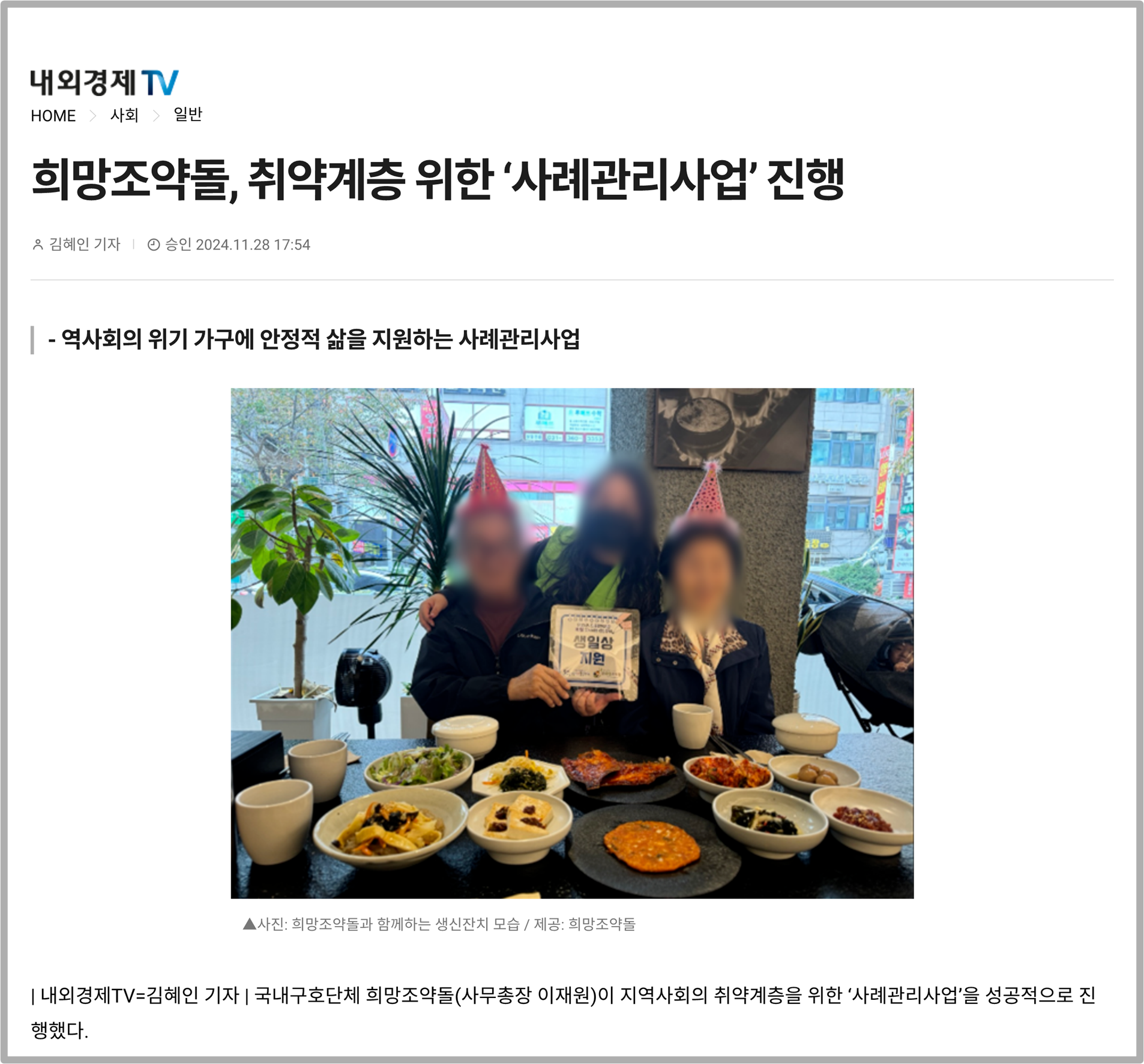 희망조약돌 관계자는 “이번 사례관리사업의 일환으로 취약계층 어르신들을 위해 생신잔치를 준비했다”라며, “어르신들에게 따뜻한 하루를 선물하고 정서적 교감을 나눌 수 있는 뜻깊은 시간을 마련했다”고 전했다.
