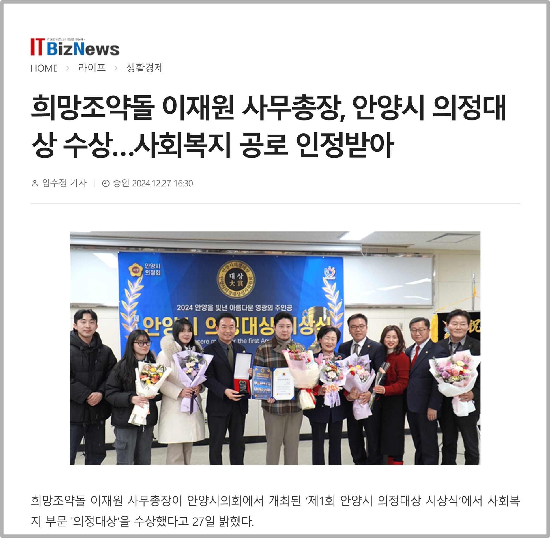 희망조약돌 이재원 사무총장, 안양시 의정대상 사회복지 부문 수상