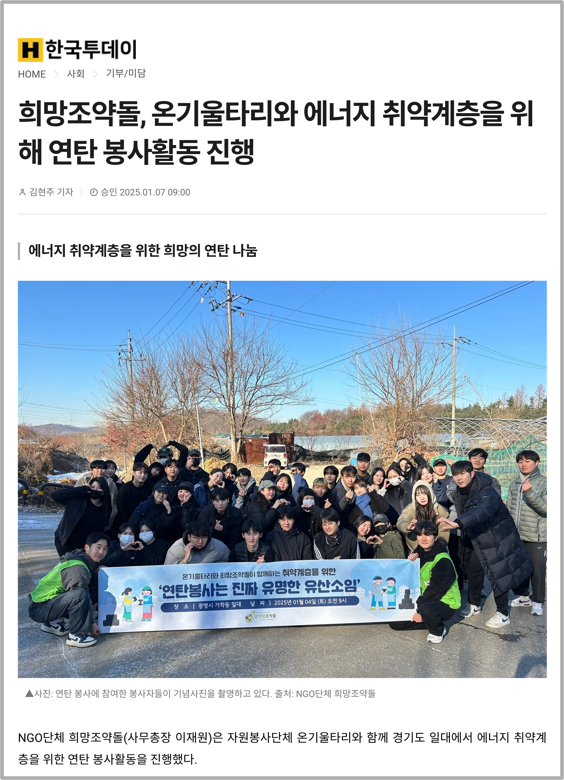 이재원 희망조약돌 사무총장은 “연탄 한 장은 겨울철 에너지 취약 계층에게는 단순한 난방 수단이 아닌 생명줄과 같다”며, “이번 연탄 봉사에 따뜻한 마음을 나눠준 온기울타리 봉사단에 깊은 감사를 전한다”고 말했다.
