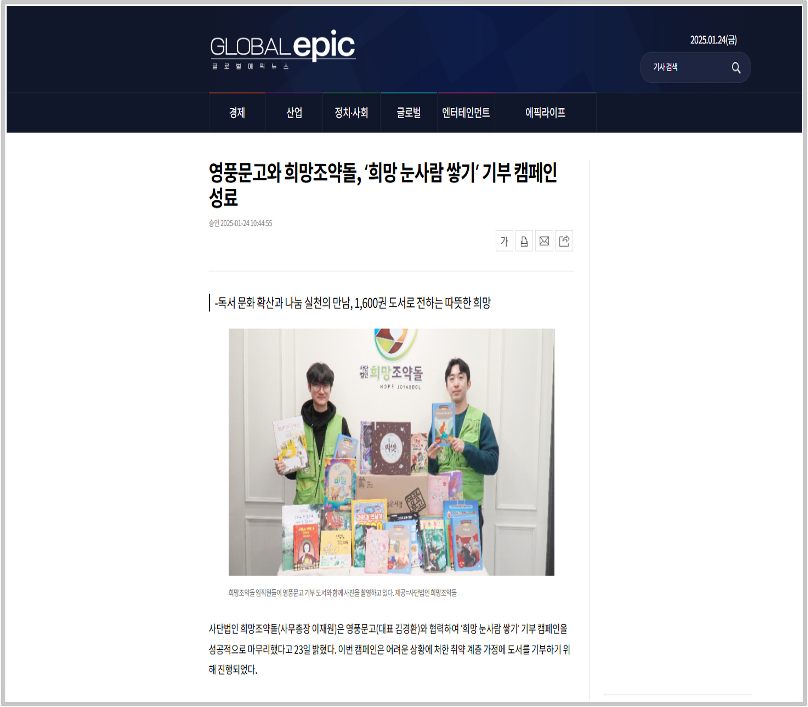 이재원 희망조약돌 사무총장은 “따뜻한 마음으로 동참해 주신 영풍문고와 회원분들께 진심으로 감사드린다”며, “이번 캠페인을 통해 취약 계층 가정에 작은 희망과 위로가 전해지길 바란다”고 전했다.