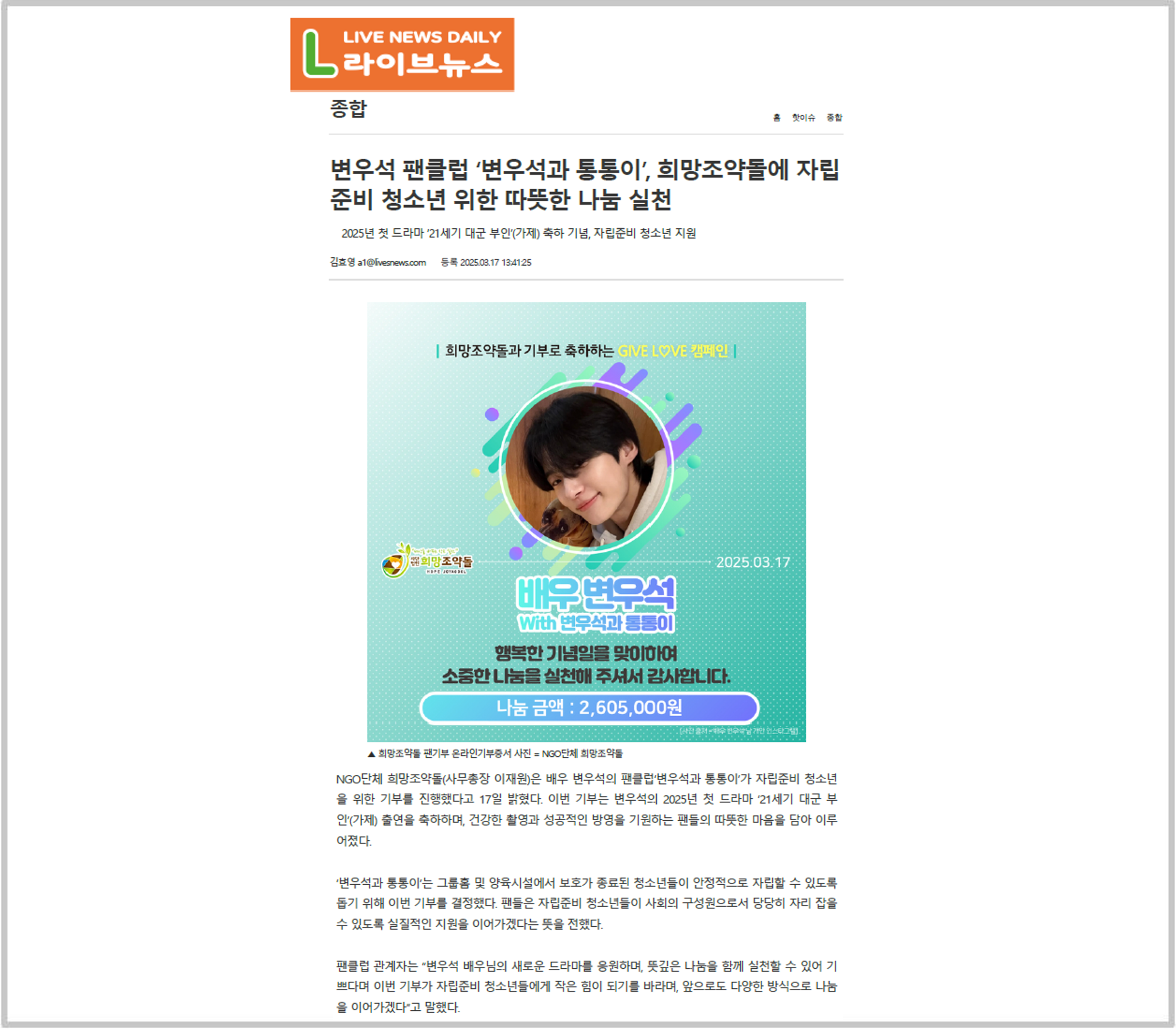 이번 기부는 변우석의 2025년 첫 드라마 ‘21세기 대군 부인’(가제) 출연을 축하하며, 건강한 촬영과 성공적인 방영을 기원하는 팬들의 따뜻한 마음을 담아 이루어졌다.
