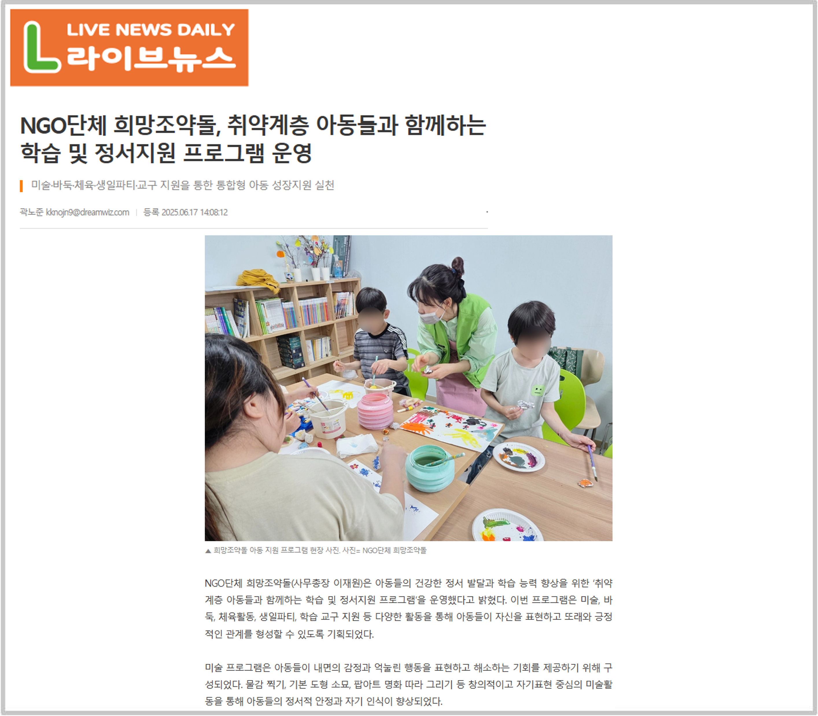 NGO단체 희망조약돌(사무총장 이재원)은 아동들의 건강한 정서 발달과 학습 능력 향상을 위한 ‘취약계층 아동들과 함께하는 학습 및 정서지원 프로그램’을 운영했다고 밝혔다. 이번 프로그램은 미술, 바둑, 체육활동, 생일파티, 학습 교구 지원 등 다양한 활동을 통해 아동들이 자신을 표현하고 또래와 긍정적인 관계를 형성할 수 있도록 기획되었다.