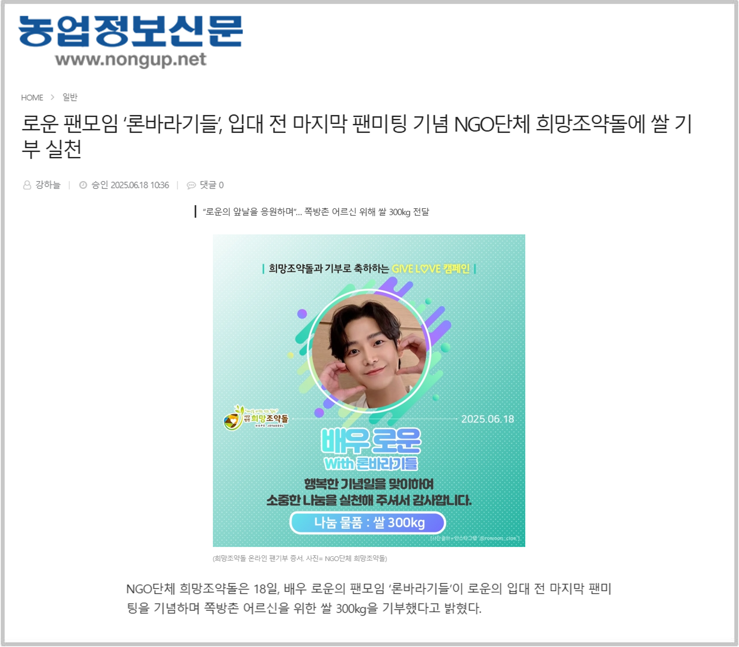 이번 기부는 지난 5월 31일 열린 팬미팅 ‘로운의 시간’을 축하하고, 오는 7월 21일 군 입대를 앞둔 배우 로운의 건강하고 무사한 복무를 응원하기 위한 의미로 진행됐다. 팬들은 “언제나 묵묵히 자신의 길을 걸어가는 로운처럼, 우리도 누군가에게 힘이 되는 선택을 하고 싶었다”며 “이 쌀이 외로운 어르신들에게 작은 위로가 되길 바란다”고 전했다.