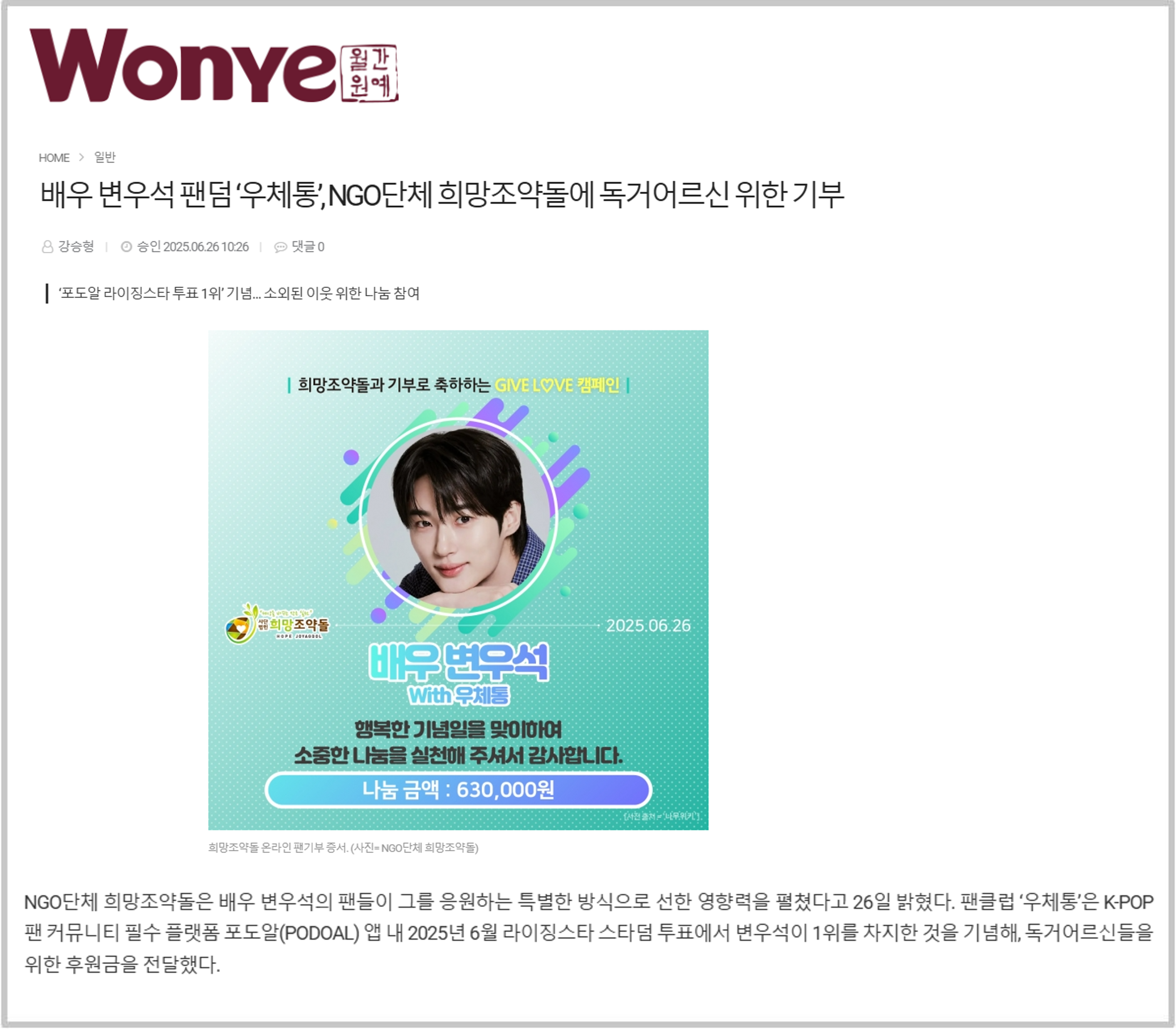 NGO단체 희망조약돌은 배우 변우석의 팬들이 그를 응원하는 특별한 방식으로 선한 영향력을 펼쳤다고 26일 밝혔다. 팬클럽 ‘우체통’은 K-POP 팬 커뮤니티 필수 플랫폼 포도알(PODOAL) 앱 내 2025년 6월 라이징스타 스타덤 투표에서 변우석이 1위를 차지한 것을 기념해, 독거어르신들을 위한 후원금을 전달했다.