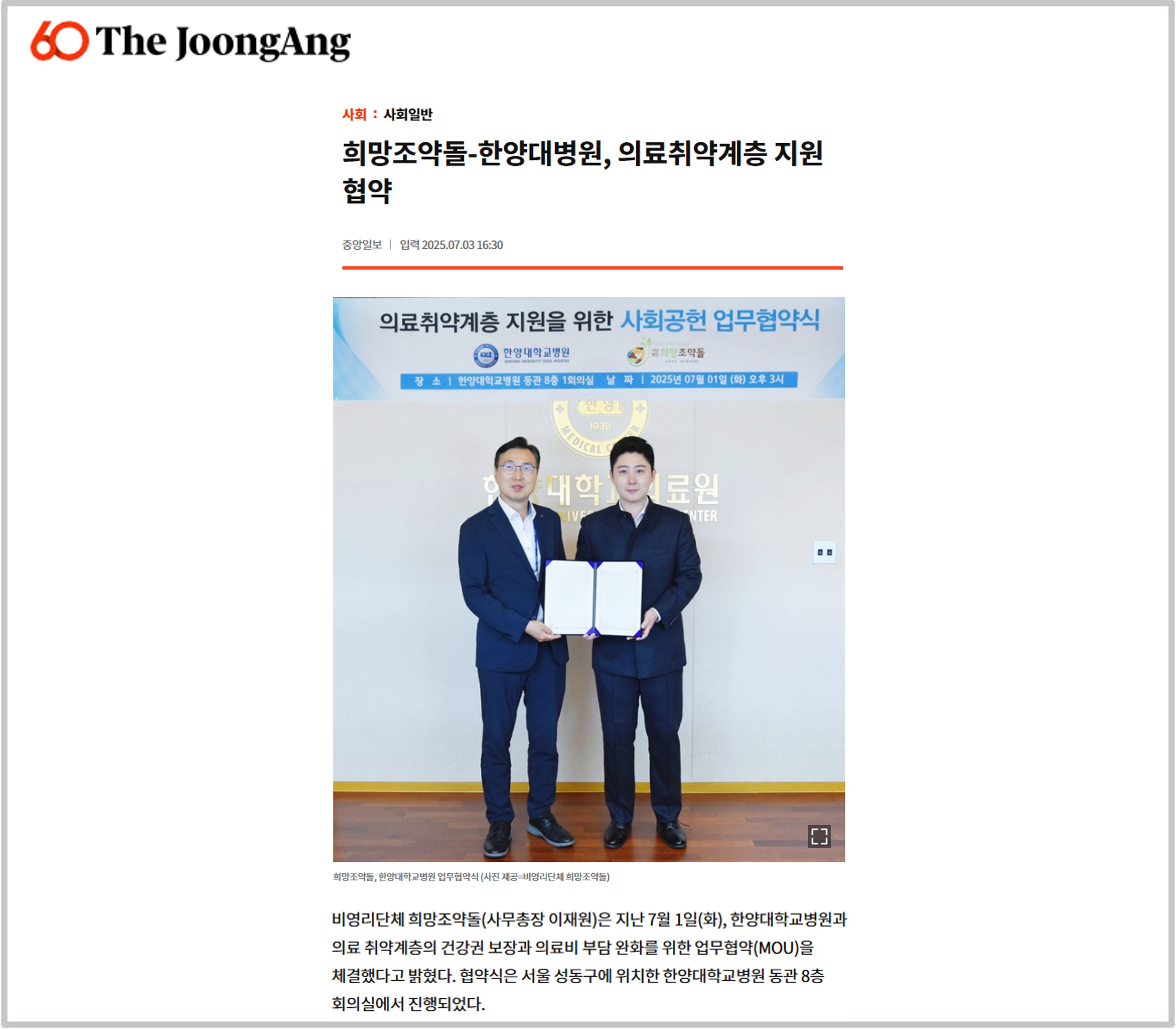 비영리단체 희망조약돌(사무총장 이재원)은 지난 7월 1일(화), 한양대학교병원과 의료 취약계층의 건강권 보장과 의료비 부담 완화를 위한 업무협약(MOU)을 체결했다고 밝혔다. 협약식은 서울 성동구에 위치한 한양대학교병원 동관 8층 회의실에서 진행되었다.
