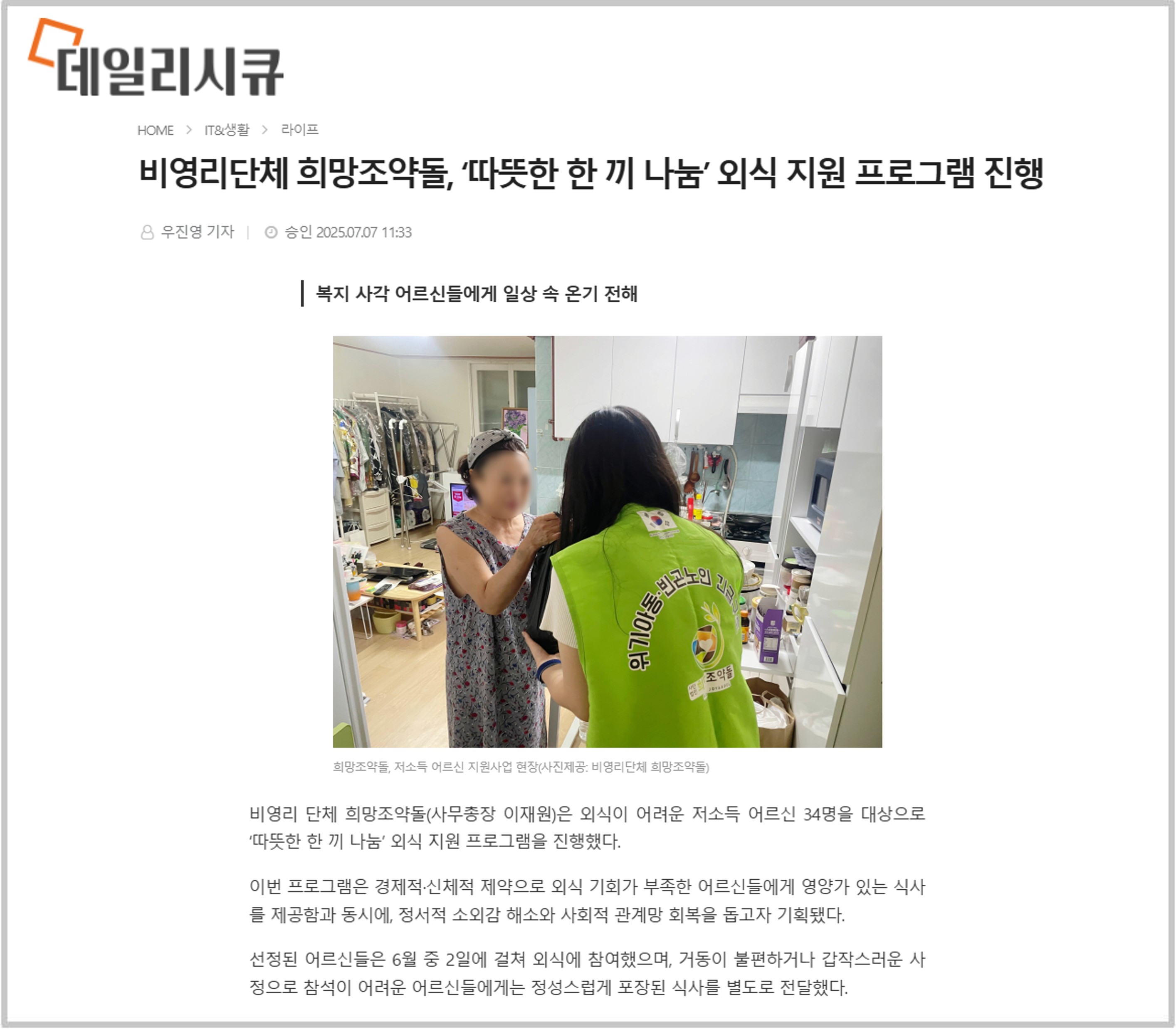 비영리 단체 희망조약돌(사무총장 이재원)은 외식이 어려운 저소득 어르신 34명을 대상으로 ‘따뜻한 한 끼 나눔’ 외식 지원 프로그램을 진행했다.