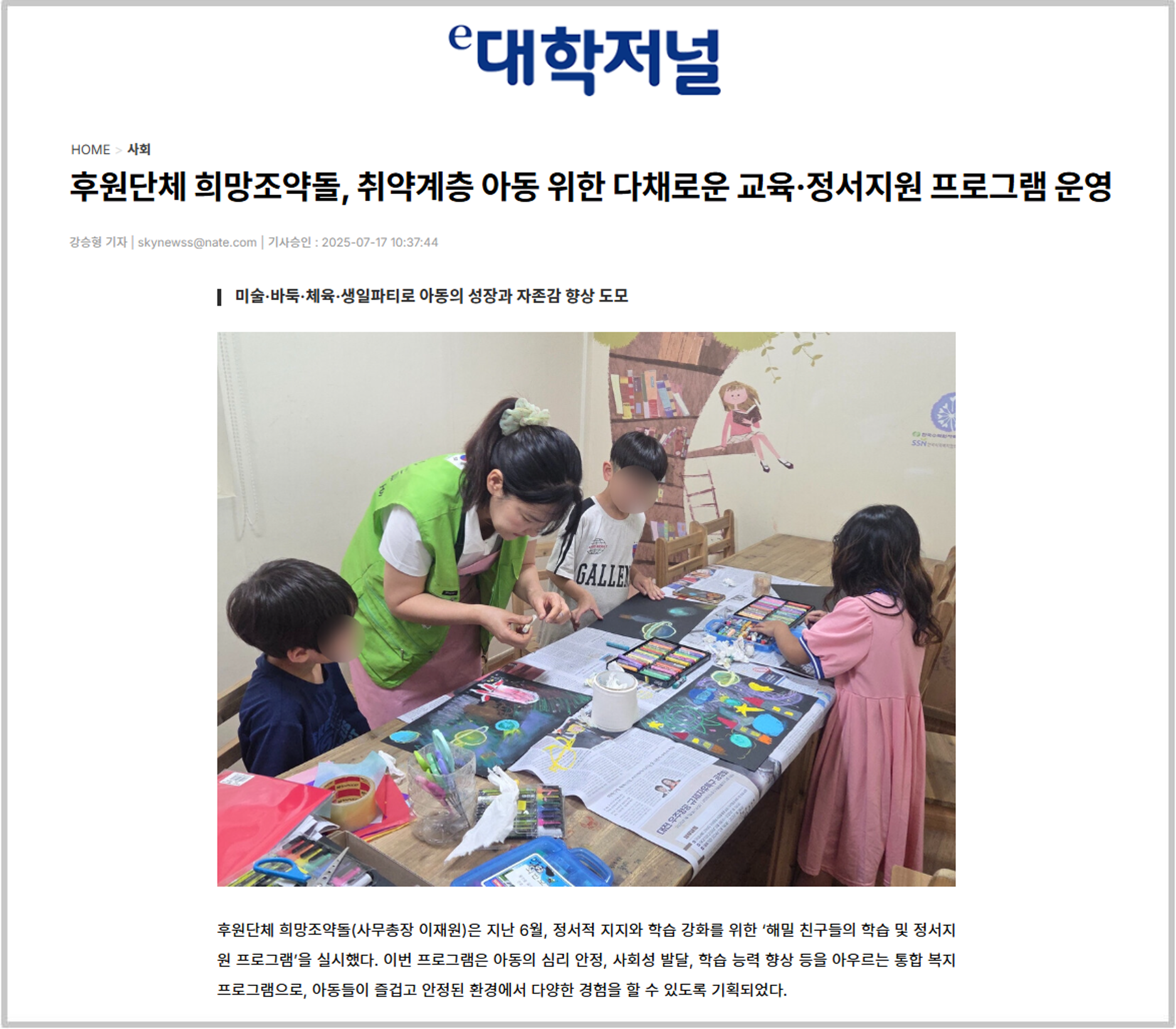 후원단체 희망조약돌(사무총장 이재원)은 지난 6월, 정서적 지지와 학습 강화를 위한 ‘해밀 친구들의 학습 및 정서지원 프로그램’을 실시했다. 이번 프로그램은 아동의 심리 안정, 사회성 발달, 학습 능력 향상 등을 아우르는 통합 복지 프로그램으로, 아동들이 즐겁고 안정된 환경에서 다양한 경험을 할 수 있도록 기획되었다.