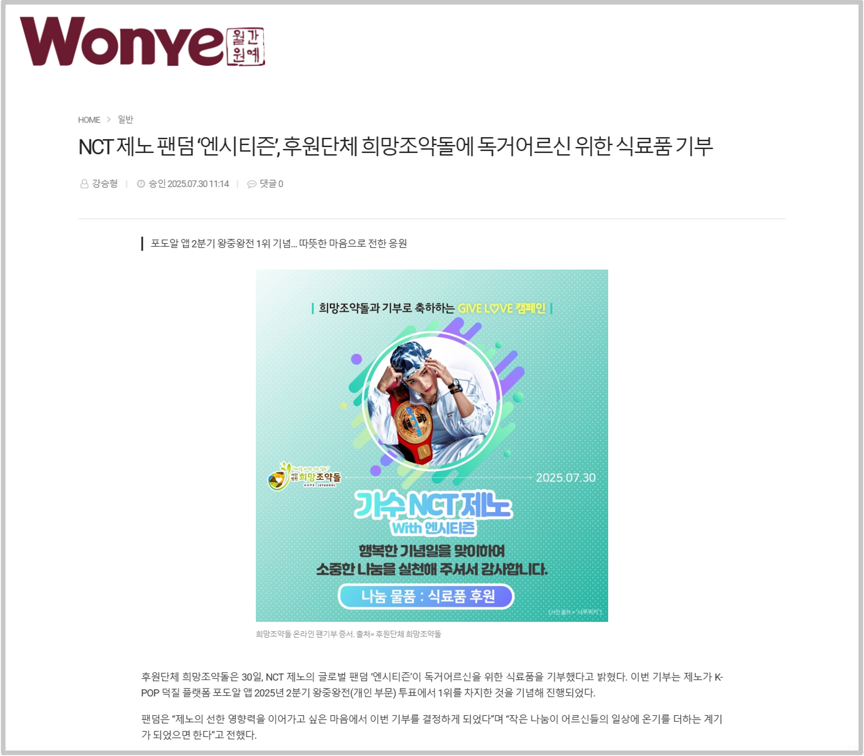 후원단체 희망조약돌은 30일, NCT 제노의 글로벌 팬덤 ‘엔시티즌’이 독거어르신을 위한 식료품을 기부했다고 밝혔다. 이번 기부는 제노가 K-POP 덕질 플랫폼 포도알 앱에서 인기투표 1위를 차지한 것을 기념해 진행되었다.