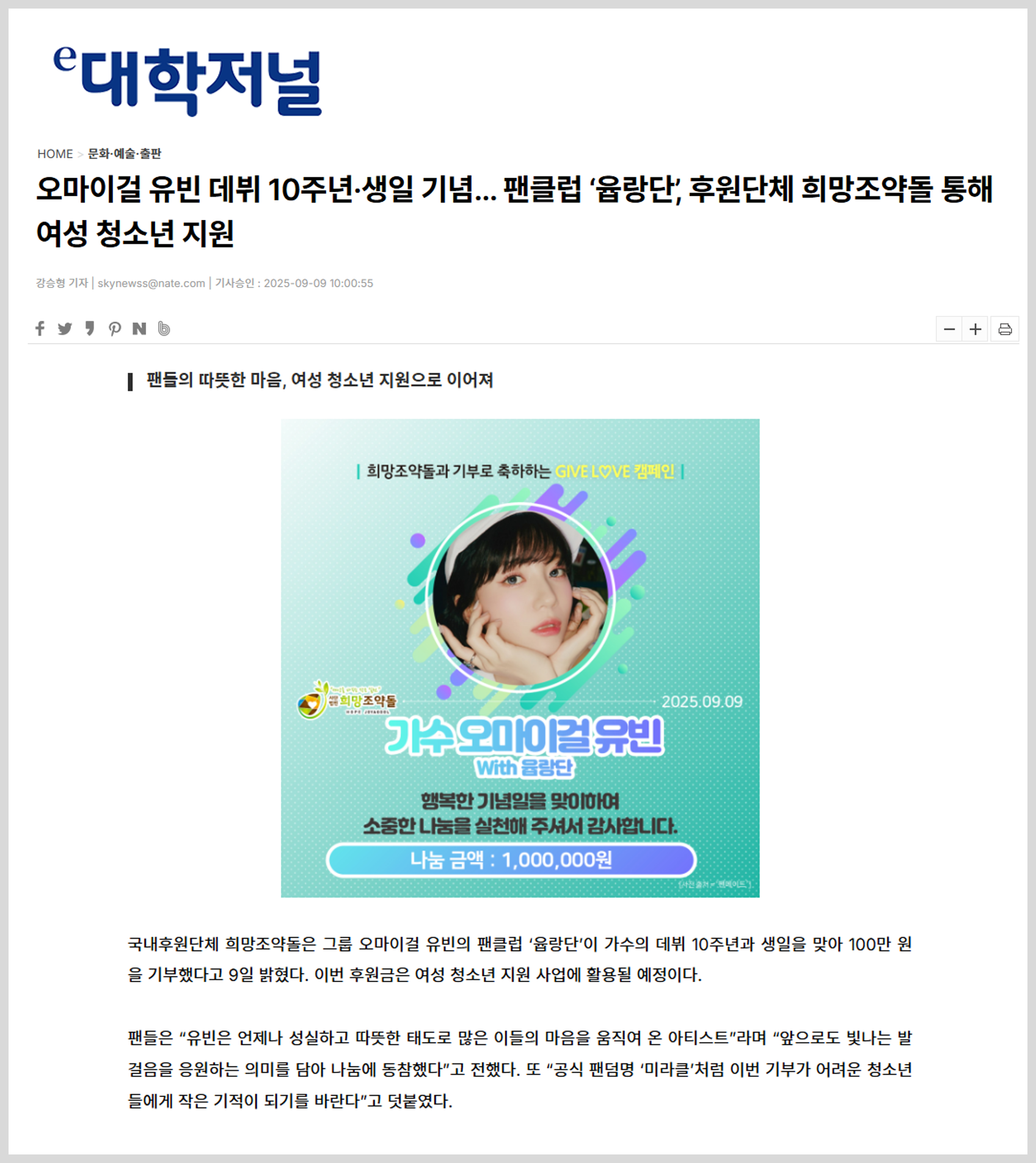 오마이걸 유빈 데뷔 10주년·생일 기념… 팬클럽 ‘윱랑단’, 후원단체 희망조약돌 통해 여성 청소년 지원