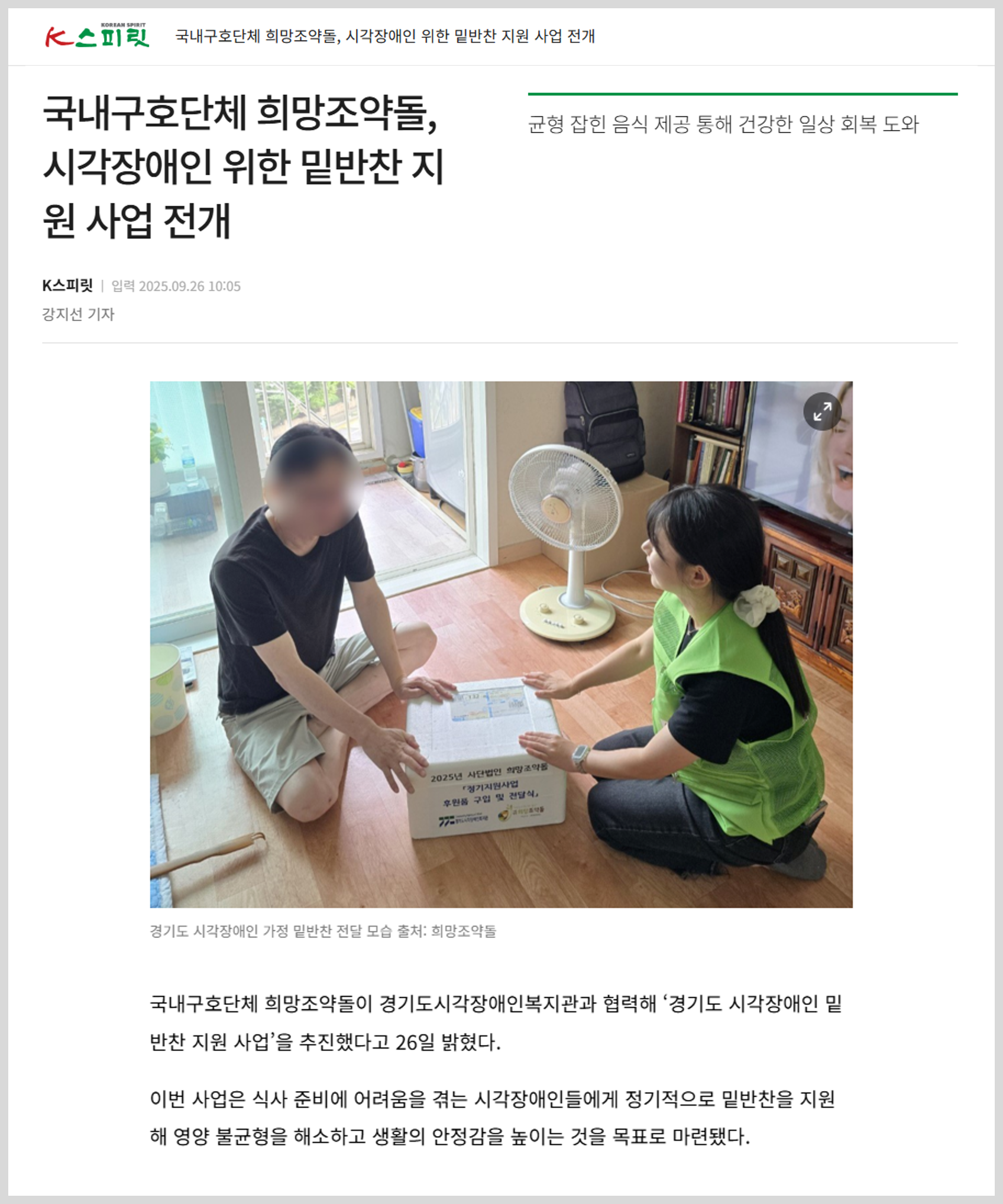 국내구호단체 희망조약돌이 경기도시각장애인복지관과 협력해 ‘경기도 시각장애인 밑반찬 지원 사업’을 추진했다고 26일 밝혔다. 이번 사업은 식사 준비에 어려움을 겪는 시각장애인들에게 정기적으로 밑반찬을 지원해 영양 불균형을 해소하고 생활의 안정감을 높이는 것을 목표로 마련됐다.