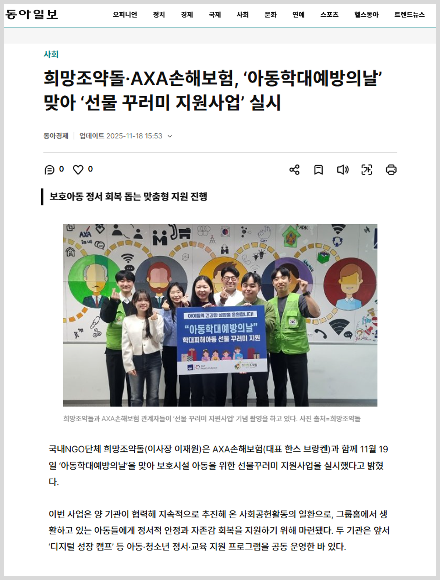 국내NGO단체 희망조약돌(이사장 이재원)은 AXA손해보험(대표 한스 브랑켄)과 함께 11월 19일 ‘아동학대예방의날’을 맞아 보호시설 아동을 위한 선물꾸러미 지원사업을 실시했다고 밝혔다. 이번 사업은 양 기관이 협력해 지속적으로 추진해 온 사회공헌활동의 일환으로, 그룹홈에서 생활하고 있는 아동들에게 정서적 안정과 자존감 회복을 지원하기 위해 마련됐다. 두 기관은 앞서 ‘디지털 성장 캠프’ 등 아동·청소년 정서·교육 지원 프로그램을 공동 운영한 바 있다.