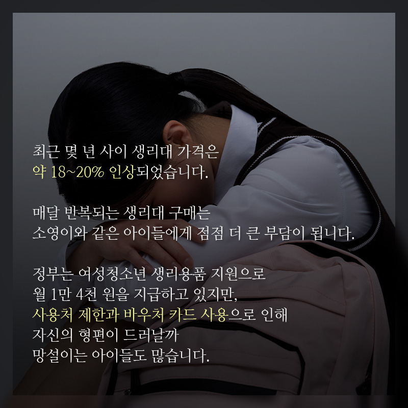 생리대의 가격상승 앞에서 소영이와 같은 아이들은 또 한 번 버거운 현실과 마주합니다.