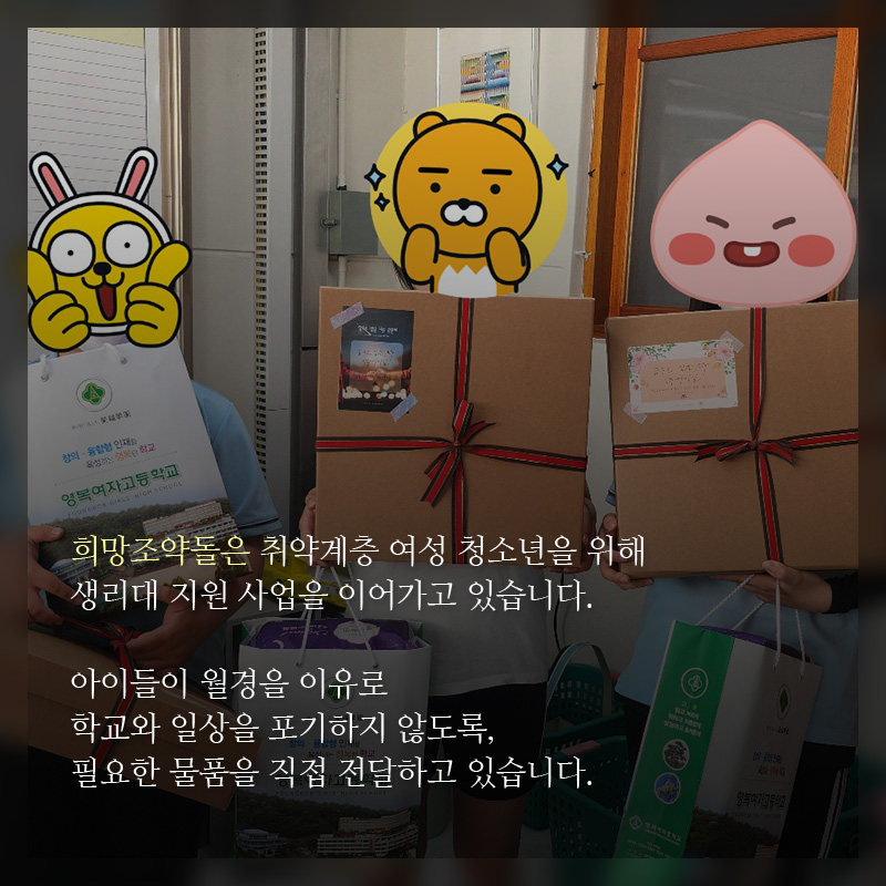 희망조약돌은 생리대 6개월분과 찜질팩 키트를 지원해