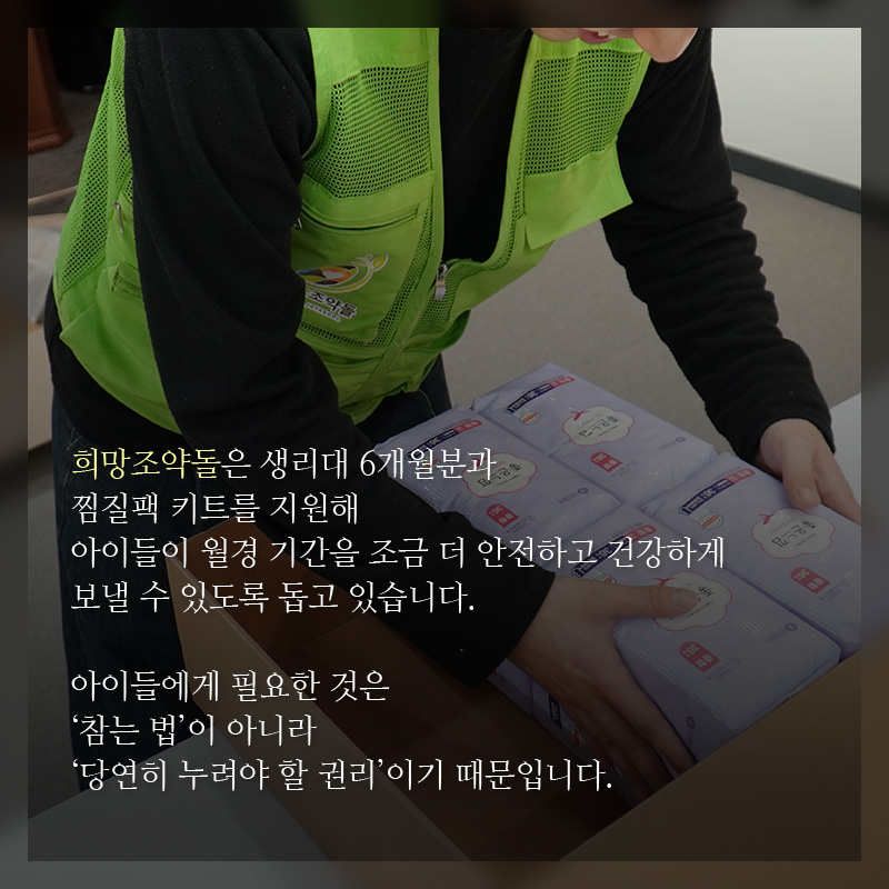 여자라면 누구나 겪는 일이지만, 마음 편히 쓸 생리대조차 부족한 아이들에게 이 시기는 매달 반복되는 커다란 불안이겠죠.