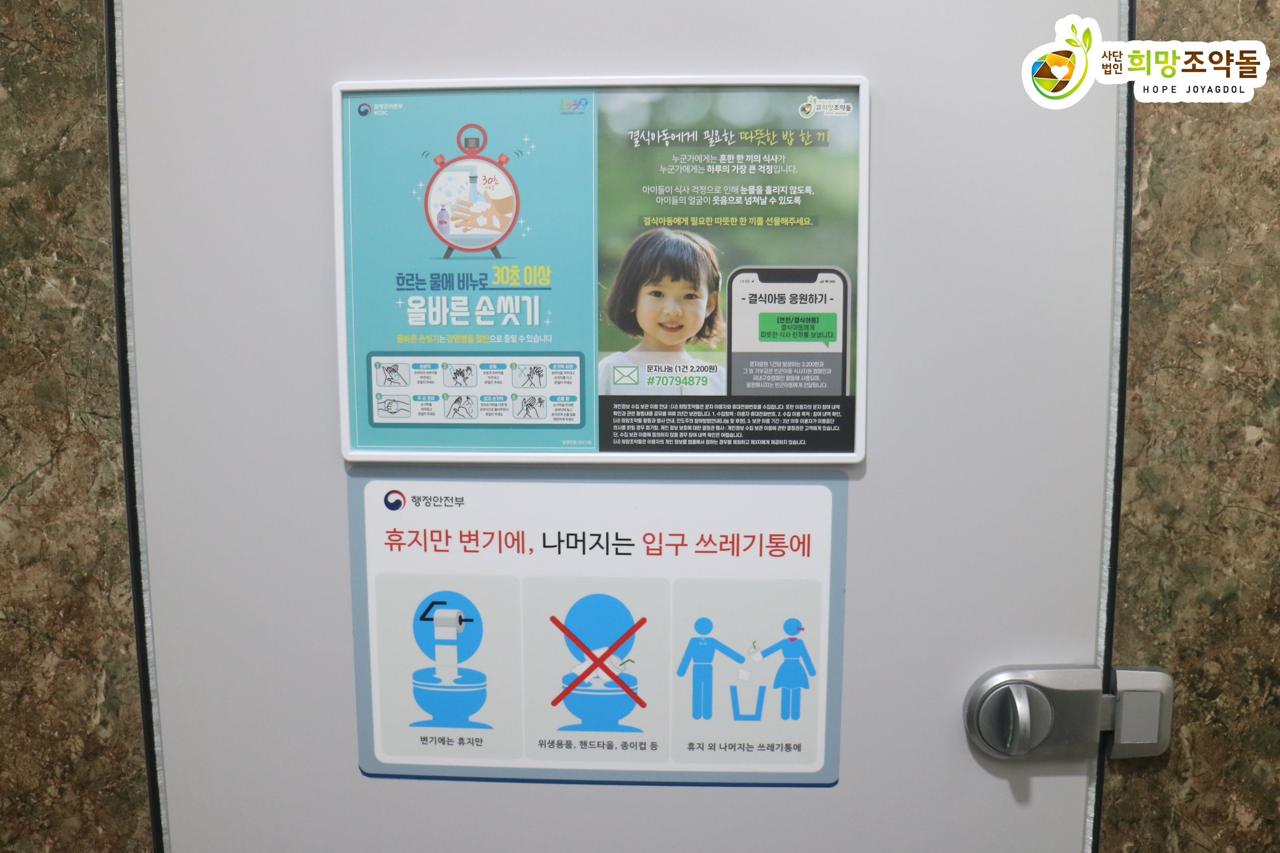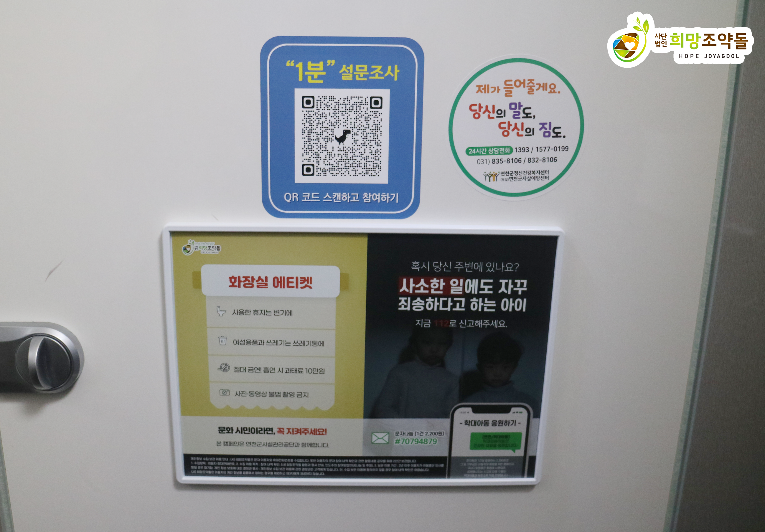 공익 포스터를 연천군시설관리공단의 화장실 칸막이 문과 세면대 등