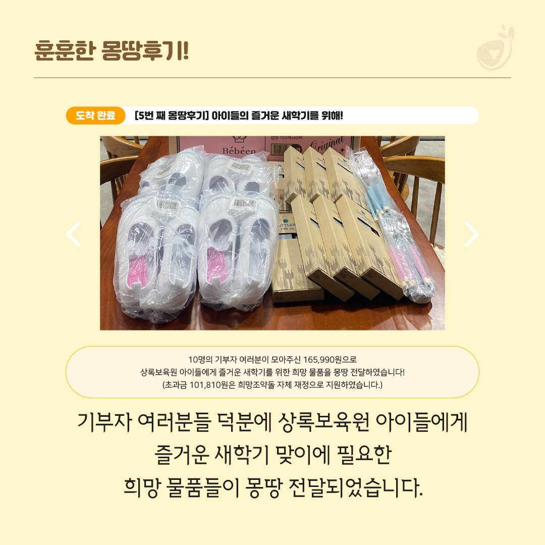 이번 기부는 상록보육원 아이들의 즐거운 새학기를 위해 진행되었으며