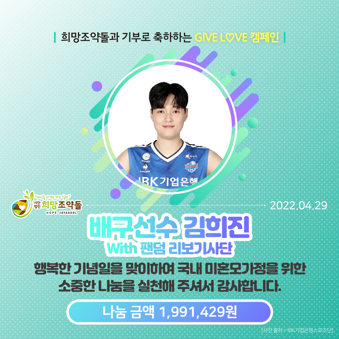 “배구선수 김희진님의 생일을 맞이하며, 팬덤 '리보기사단'과 선한 영향력을 함께합니다."