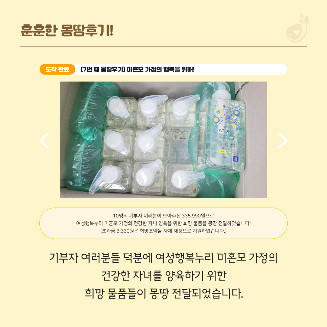 건강한 자녀 양육을 누리는데 필요한 희망 물품을 몽땅 전달할 수 있었습니다.