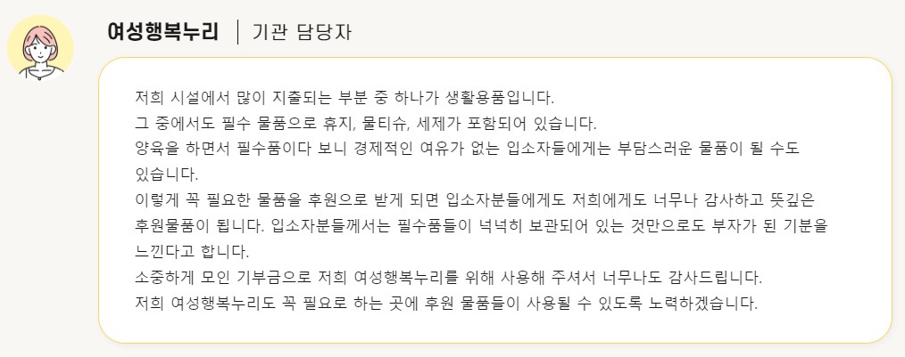 "소중하게 모인 기부금으로 저희 여성행복누리를 위해 사용해 주셔서 너무나도 감사드립니다.