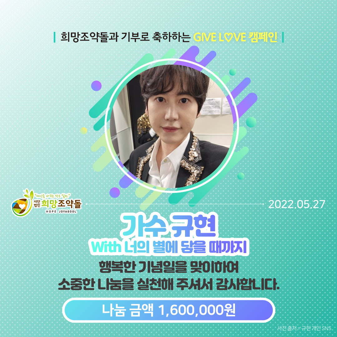 “언제나 빛나는 규현님 데뷔 16주년을 맞이하여, 너의 별에 닿을 때까지가 나눔에 동참합니다."