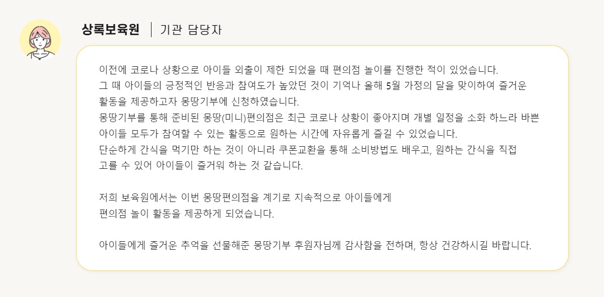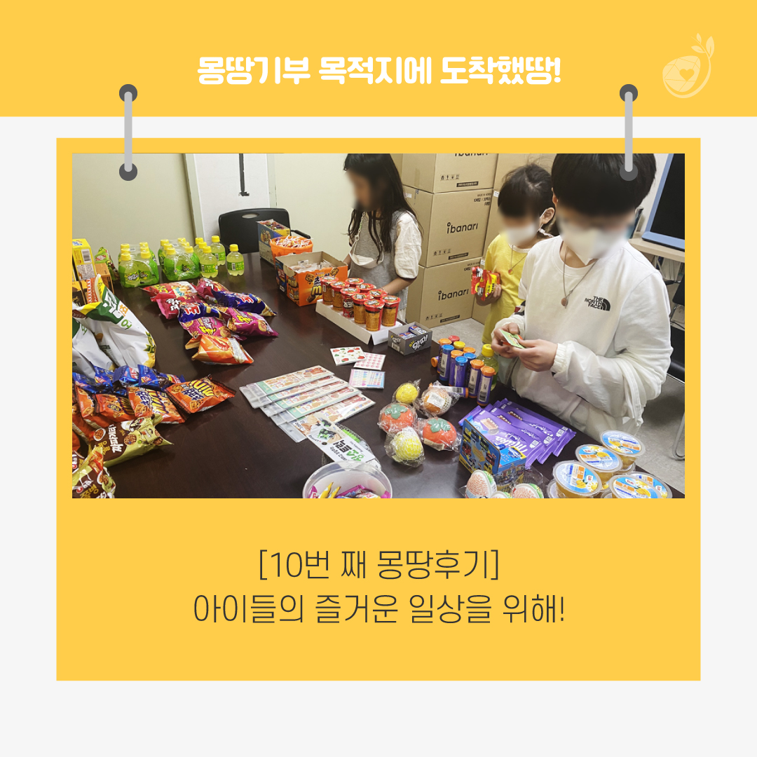 오늘은 몽땅기부와 함께 해주신 기부자분들의 소중한 마음이 전달된