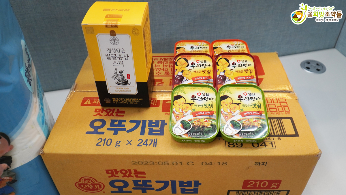샘표 반찬 통조림 6종, 벌꿀홍삼스틱 30포, 보양죽 10팩, 휴지, 밥 등 다양한 식료품과 생필품으로 구성하여