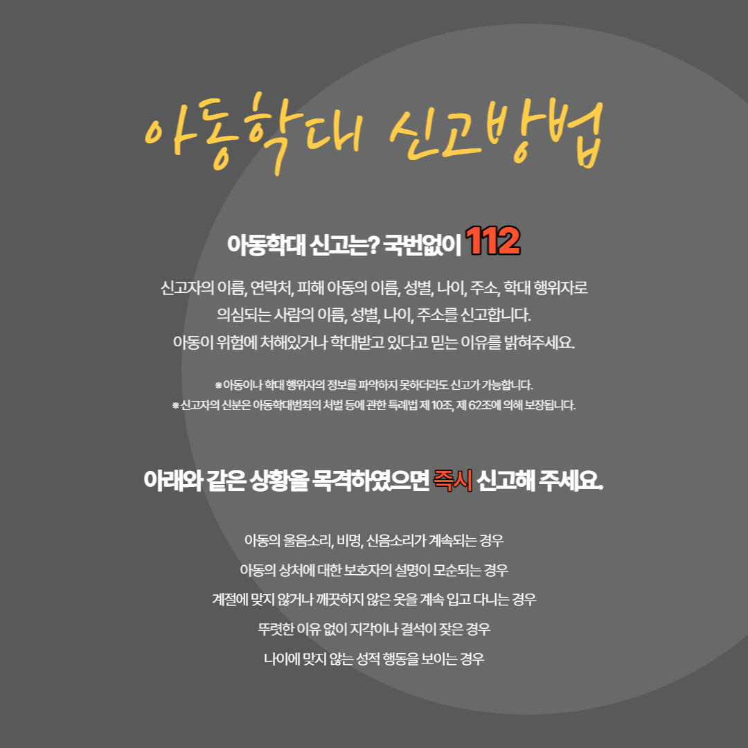 신고자의 이름, 연락처를 밝히고 피해 아동의 이름,
