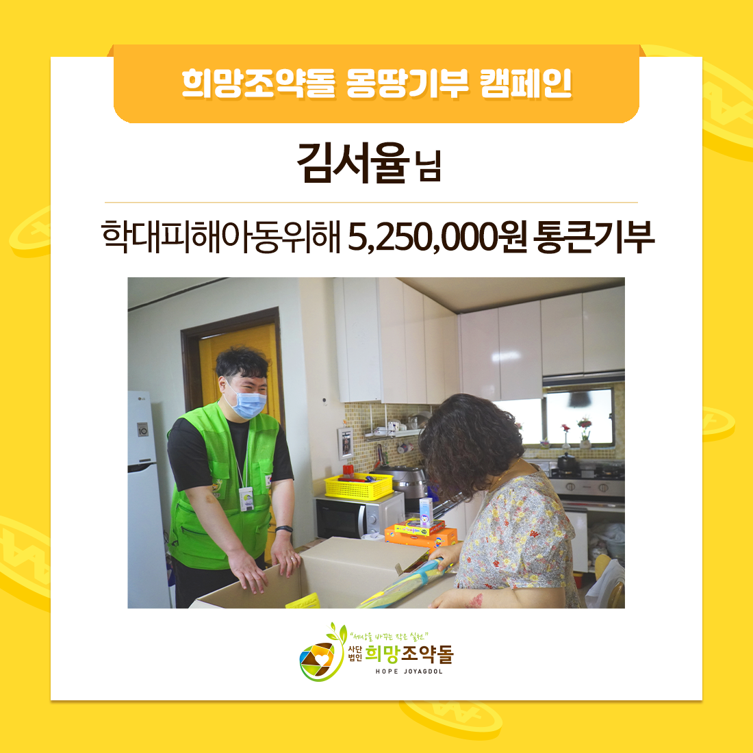 희망조약돌에 해주신 통큰기부는 김서율님의 뜻대로 학대피해아동을 위한 전세보증금 지원, 희망박스로 전달되었어요!