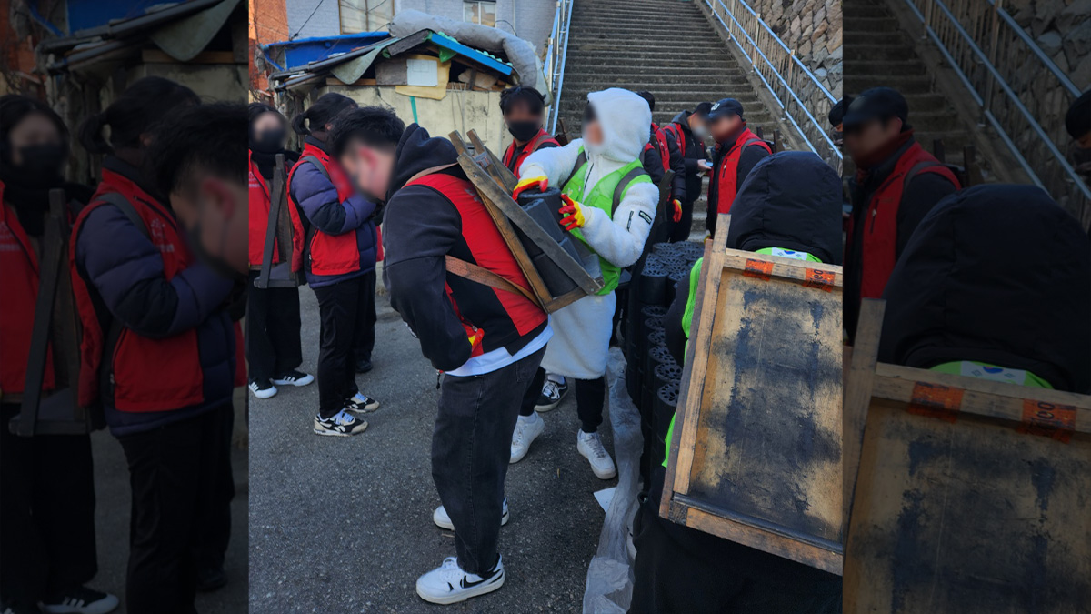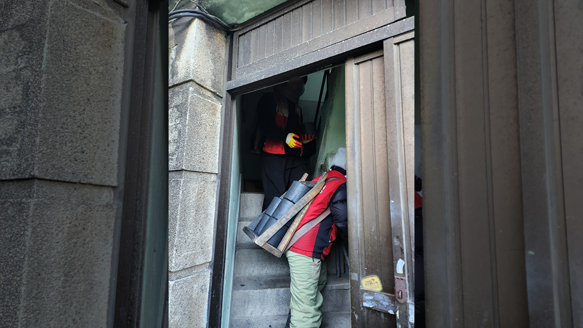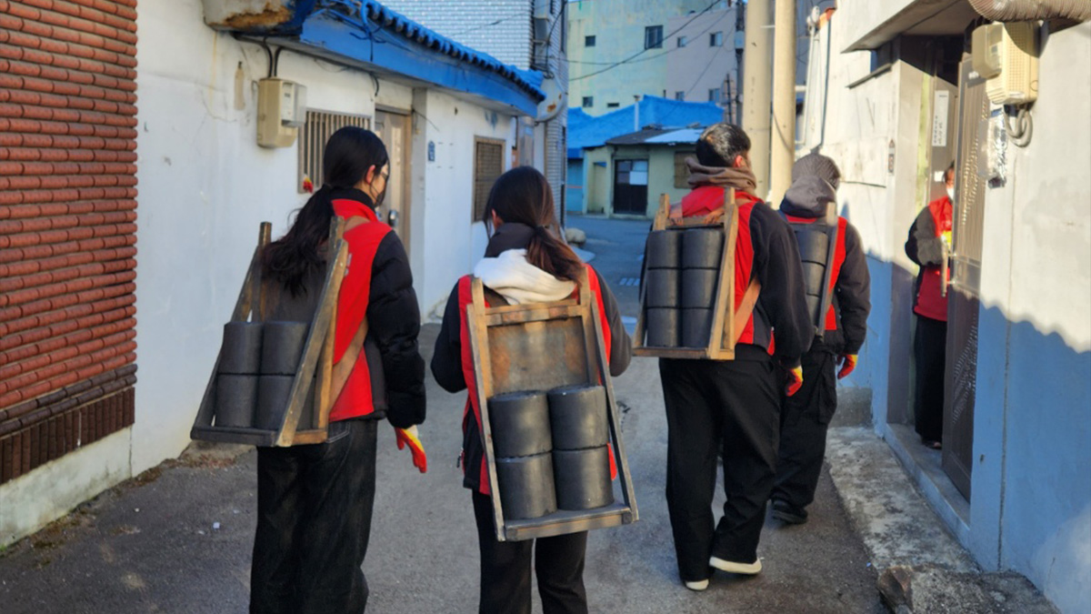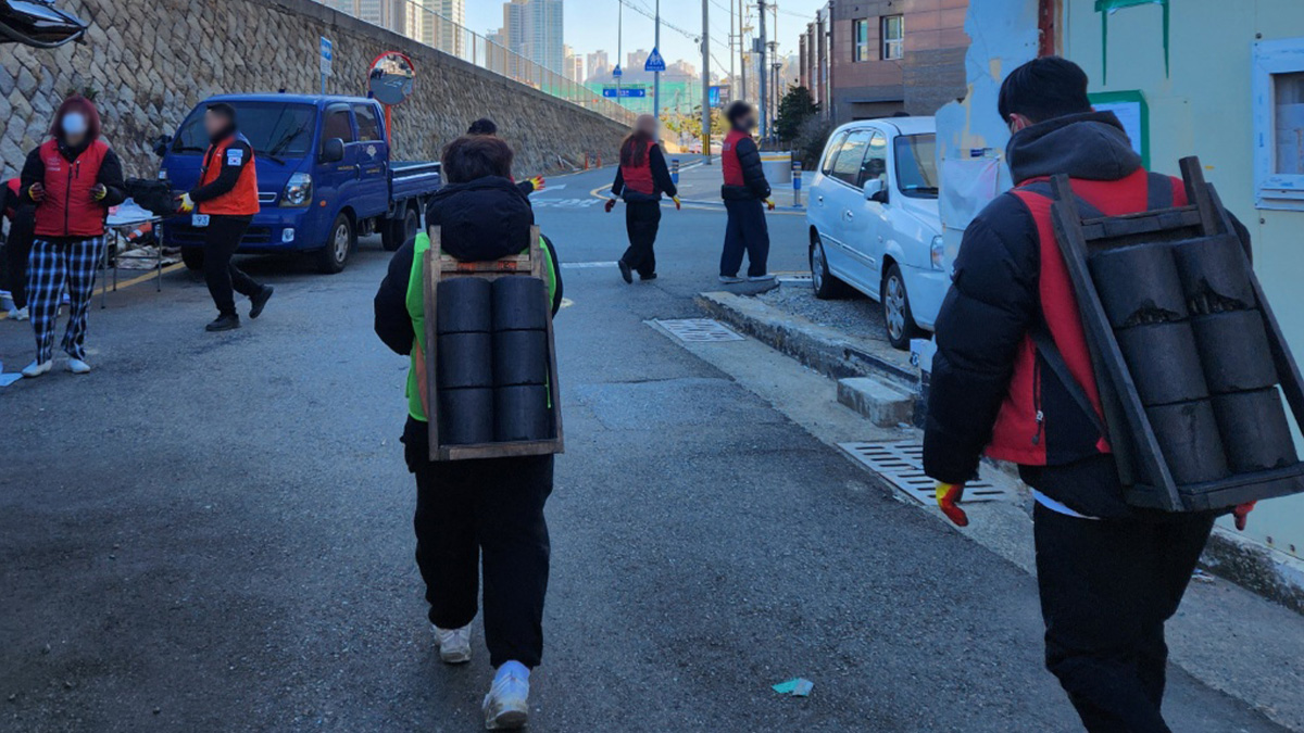 봉사자분들에게 최대한 연탄가루가 묻지 않게