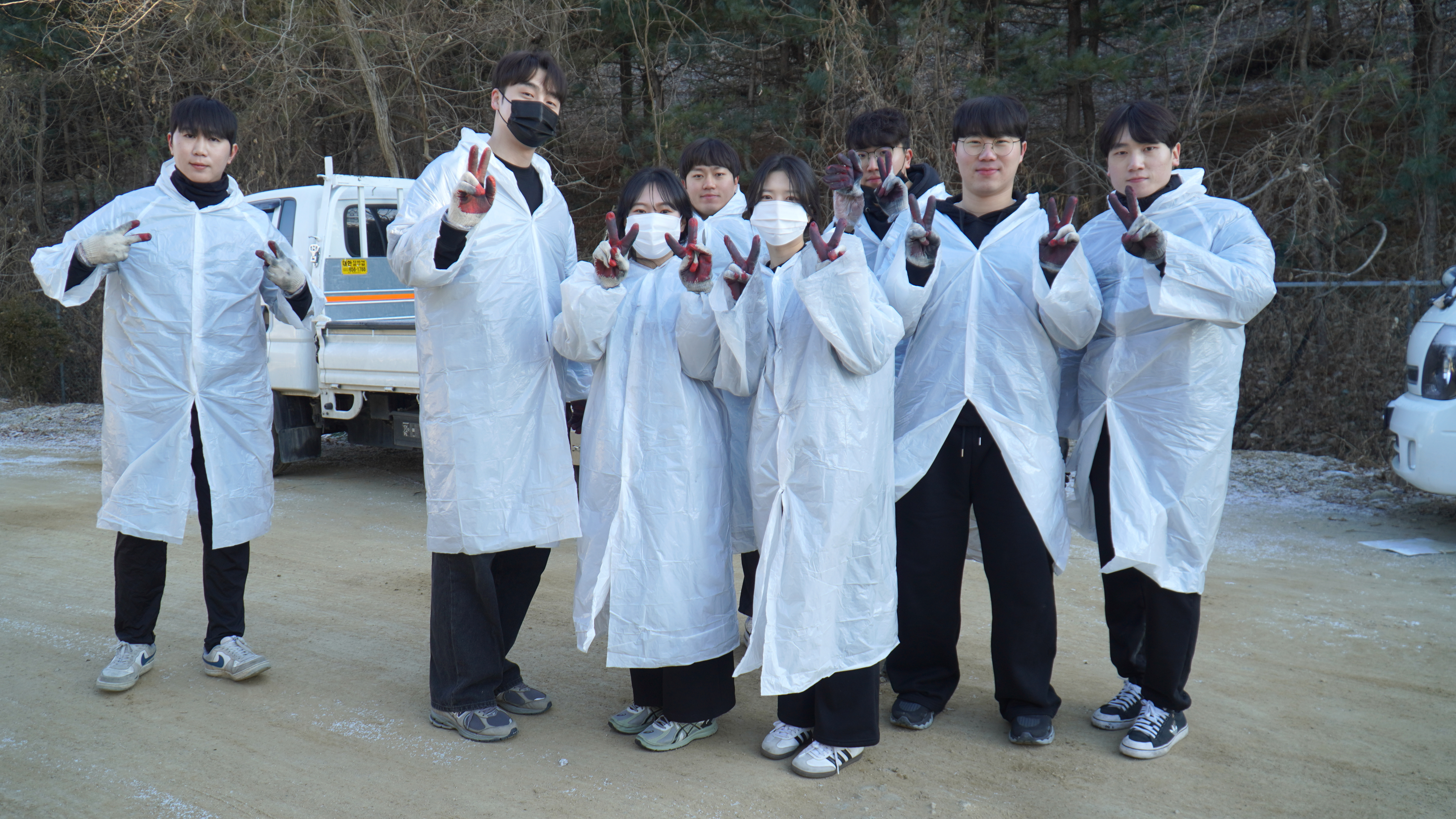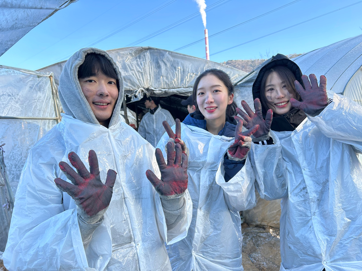 범벅이 되고 입고 있던 비닐 옷에도 검은 자국이 여기저기 남았습니다.